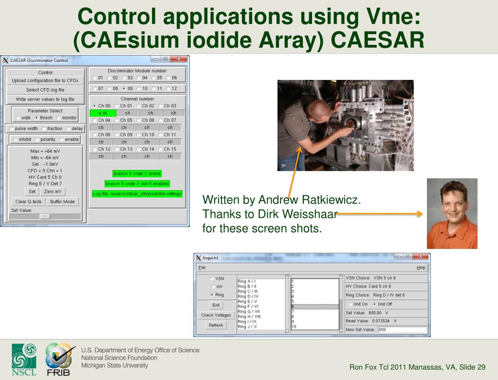 Control applications using Vme:(CAEsium iodide Array) CAESAR Written by Andrew Ratkiewicz. Thanks to Dirk Weisshaar for these screen shots.