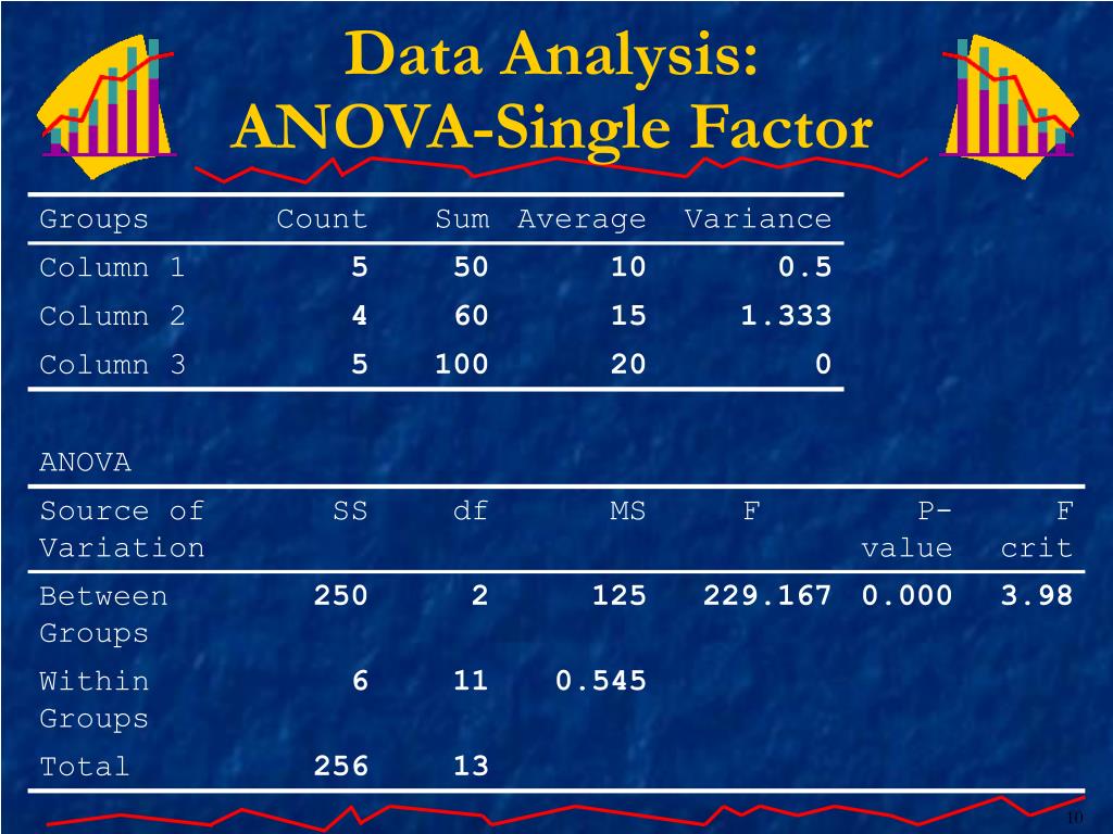 One-Way ANOVA: Example • H0: 1 = 2 = 3 • HA: The means are not all equal • Test Statistic • F = BSV / WSV with k-1,nT-k d.f. • Decision Rule • Reject H0 if F > F • Intuition • If BSV is “large” then H0 is unlikely to be true _ =