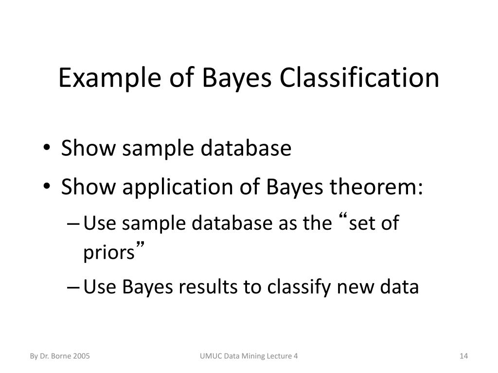 Example of Bayes Classification • Show sample database • Show application of Bayes theorem: • Use sample database as the “set of priors” • Use Bayes results to classify new data UMUC Data Mining Lecture 4