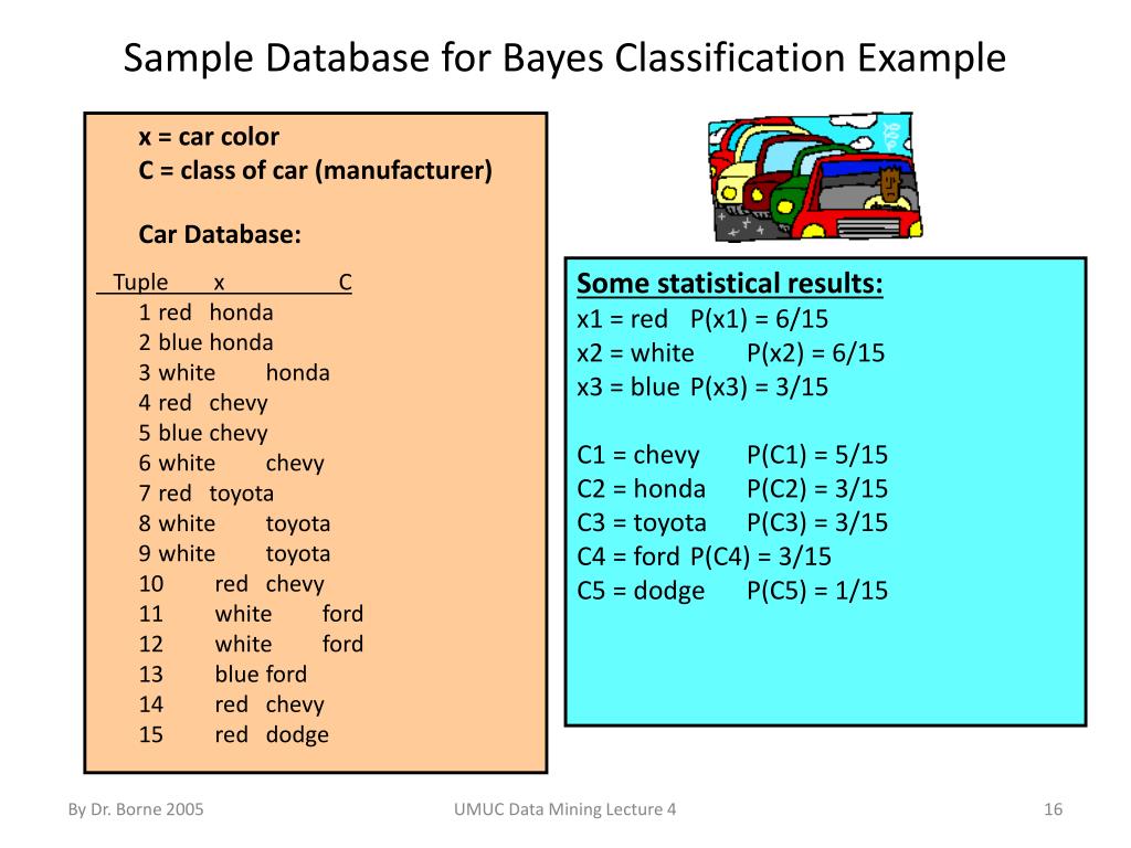 Sample Database for Bayes Classification Example x = car colorC = class of car (manufacturer)Car Database: Tuple x C 1 red honda2 blue honda3 white honda4 red chevy5 blue chevy6 white chevy7 red toyota8 white toyota9 white toyota10 red chevy11 white ford12 white ford13 blue ford14 red chevy15 red dodge Some statistical results: x1 = red P(x1) = 6/15x2 = white P(x2) = 6/15x3 = blue P(x3) = 3/15C1 = chevy P(C1) = 5/15C2 = honda P(C2) = 3/15C3 = toyota P(C3) = 3/15C4 = ford P(C4) = 3/15C5 = dodge P(C5) = 1/15 UMUC Data Mining Lecture 4