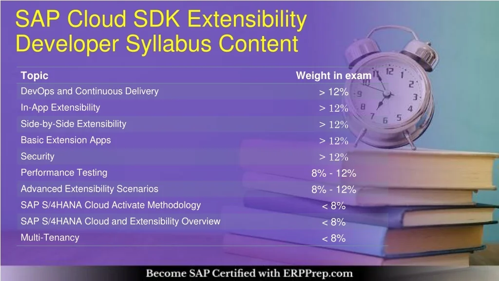 SAP Cloud SDK Extensibility Developer Syllabus Content Topic DevOps and Continuous Delivery Weight in exam > 12% > 12% > 12% > 12% > 12% 8% - 12% 8% - 12% < 8% < 8% < 8% In-App Extensibility Side-by-Side Extensibility Basic Extension Apps Security Performance Testing Advanced Extensibility Scenarios SAP S/4HANA Cloud Activate Methodology SAP S/4HANA Cloud and Extensibility Overview Multi-Tenancy