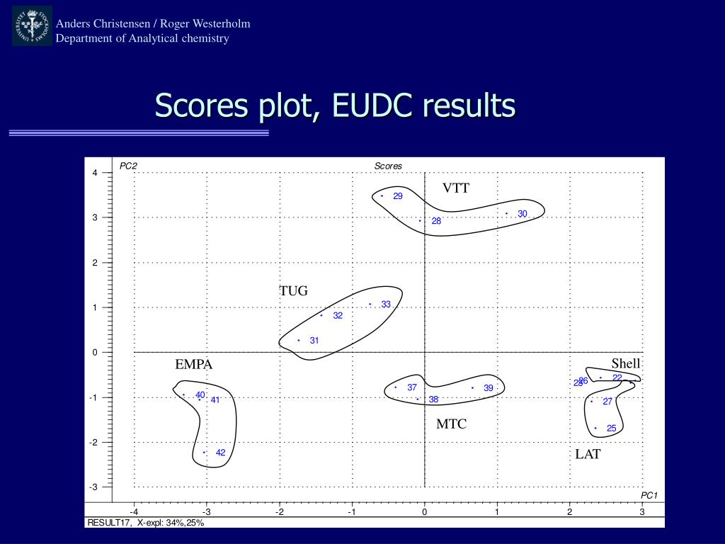 Anders Christensen / Roger Westerholm Department of Analytical chemistry Scores plot, EUDC results VTT TUG Shell EMPA MTC LAT