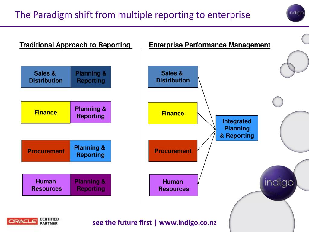 The Paradigm shift from multiple reporting to enterprise Traditional Approach to Reporting Enterprise Performance Management Sales & Distribution Planning & Reporting Sales & Distribution Finance Planning & Reporting Finance Integrated Planning & Reporting Procurement Procurement Planning & Reporting Human Resources Planning & Reporting Human Resources
