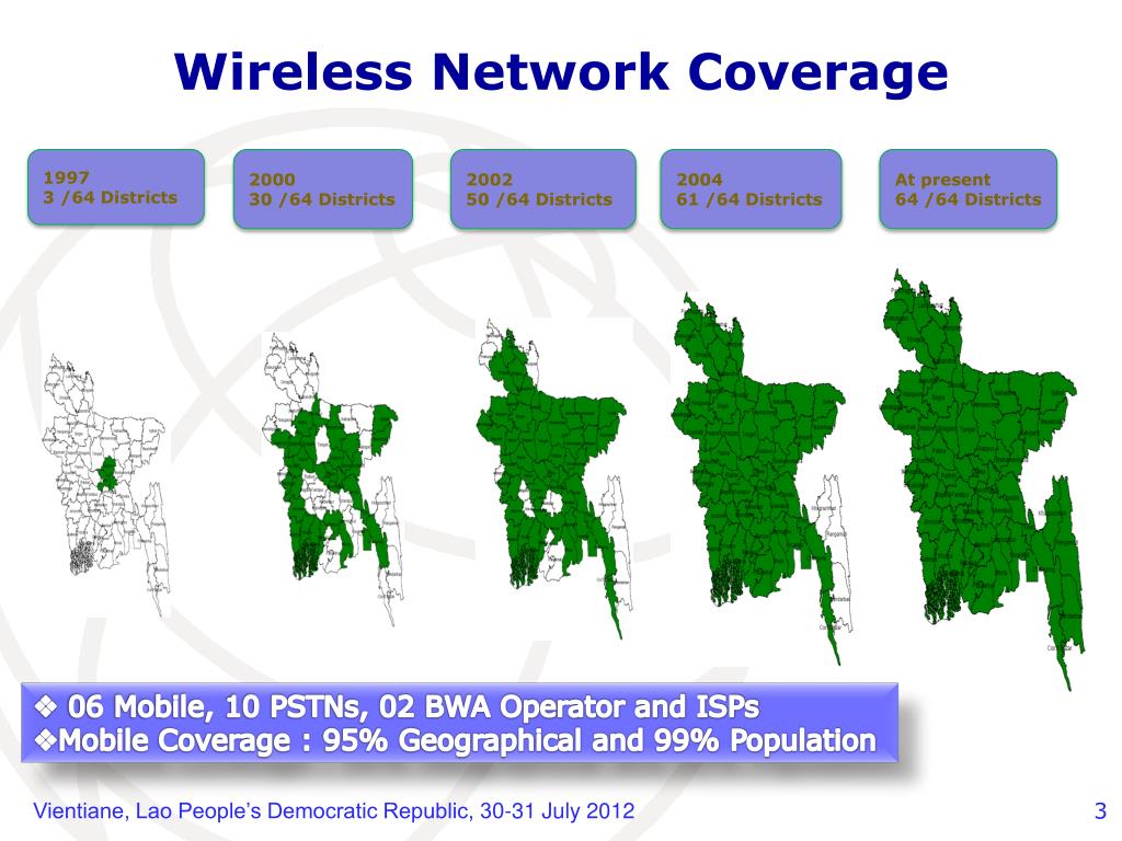 Wireless Network Coverage 1997 3 /64 Districts 2000 30 /64Districts 2002 50 /64Districts 2004 61 /64Districts At present 64 /64Districts • 06 Mobile, 10 PSTNs, 02 BWA Operator and ISPs • Mobile Coverage : 95% Geographical and 99% Population