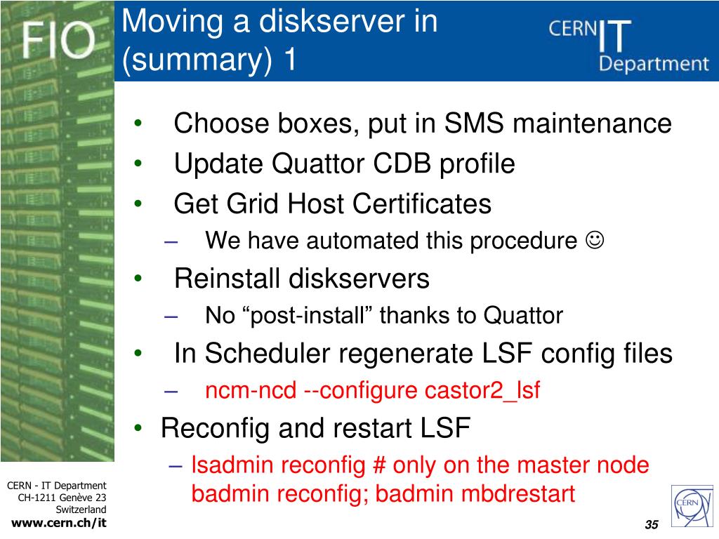 Moving a diskserver out (summary) 2 • Clean obsolete diskcopies in DB • diskServer_qry lxfsXXX.cern.ch -d |grep /srv/castor/xxx | awk '{print $1}' | grep -v DiskCopyId | xargscleanLostFiles • Wipeout filesystems • /usr/sbin/fileserver-datadisk-setup.sh --force --wipe --raw --prefix /srv/castor/ • Edit CDB profile & reconfigure server • Remove diskserver from stager DB • rmAdminNode -d -n lxfsXXXX.cern.ch 34