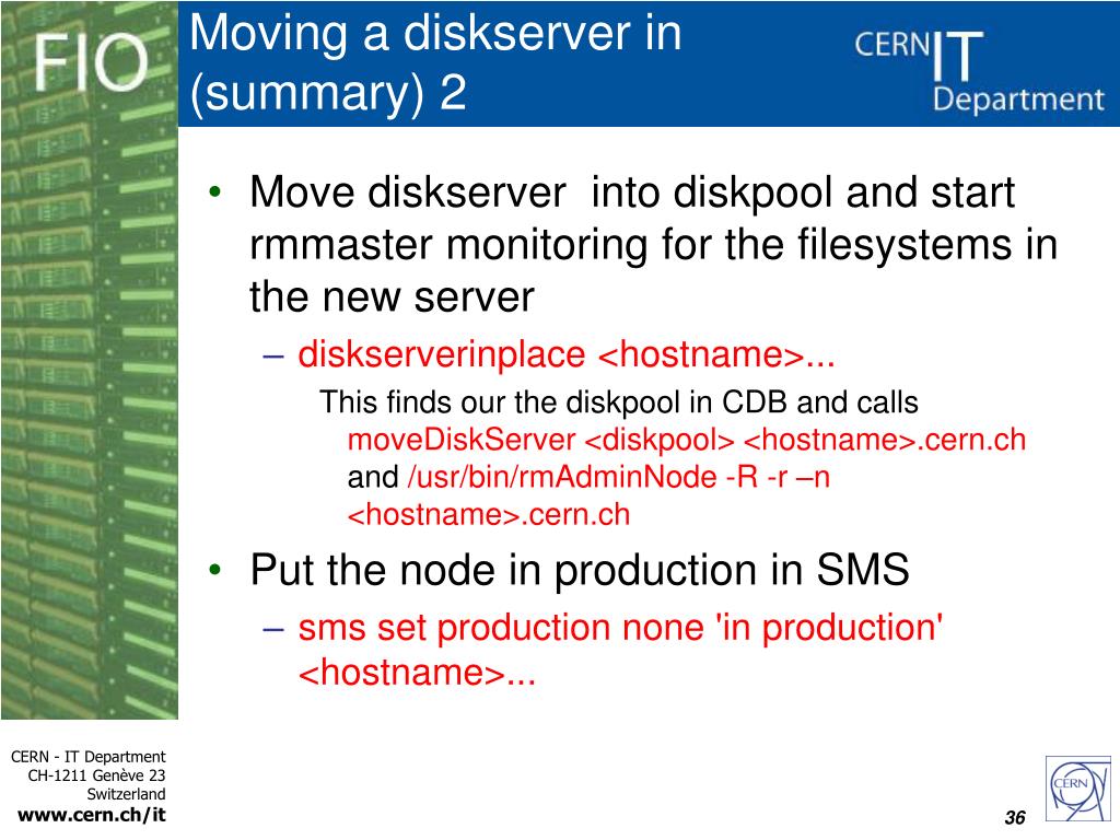 Moving a diskserver in (summary) 1 • Choose boxes, put in SMS maintenance • Update Quattor CDB profile • Get Grid Host Certificates • We have automated this procedure • Reinstall diskservers • No “post-install” thanks to Quattor • In Scheduler regenerate LSF config files • ncm-ncd --configure castor2_lsf • Reconfig and restart LSF • lsadminreconfig # only on the master node badminreconfig; badminmbdrestart 35