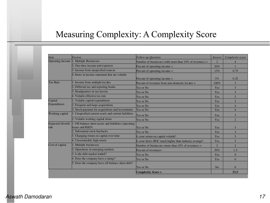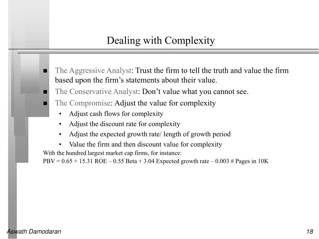 Dealing with Complexity • The Aggressive Analyst: Trust the firm to tell the truth and value the firm based upon the firm’s statements about their value. • The Conservative Analyst: Don’t value what you cannot see. • The Compromise: Adjust the value for complexity • Adjust cash flows for complexity • Adjust the discount rate for complexity • Adjust the expected growth rate/ length of growth period • Value the firm and then discount value for complexity With the hundred largest market cap firms, for instance: PBV = 0.65 + 15.31 ROE – 0.55 Beta + 3.04 Expected growth rate – 0.003 # Pages in 10K