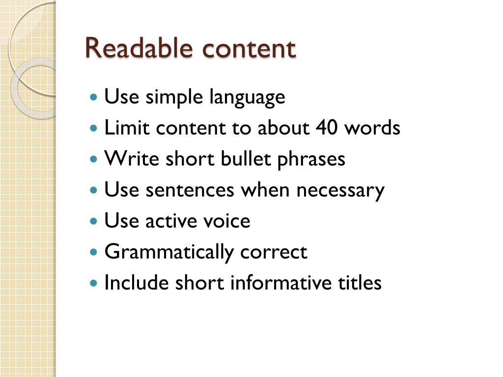 Readable content • Use simple language • Limit content to about 40 words • Write short bullet phrases • Use sentences when necessary • Use active voice • Grammatically correct • Include short informative titles