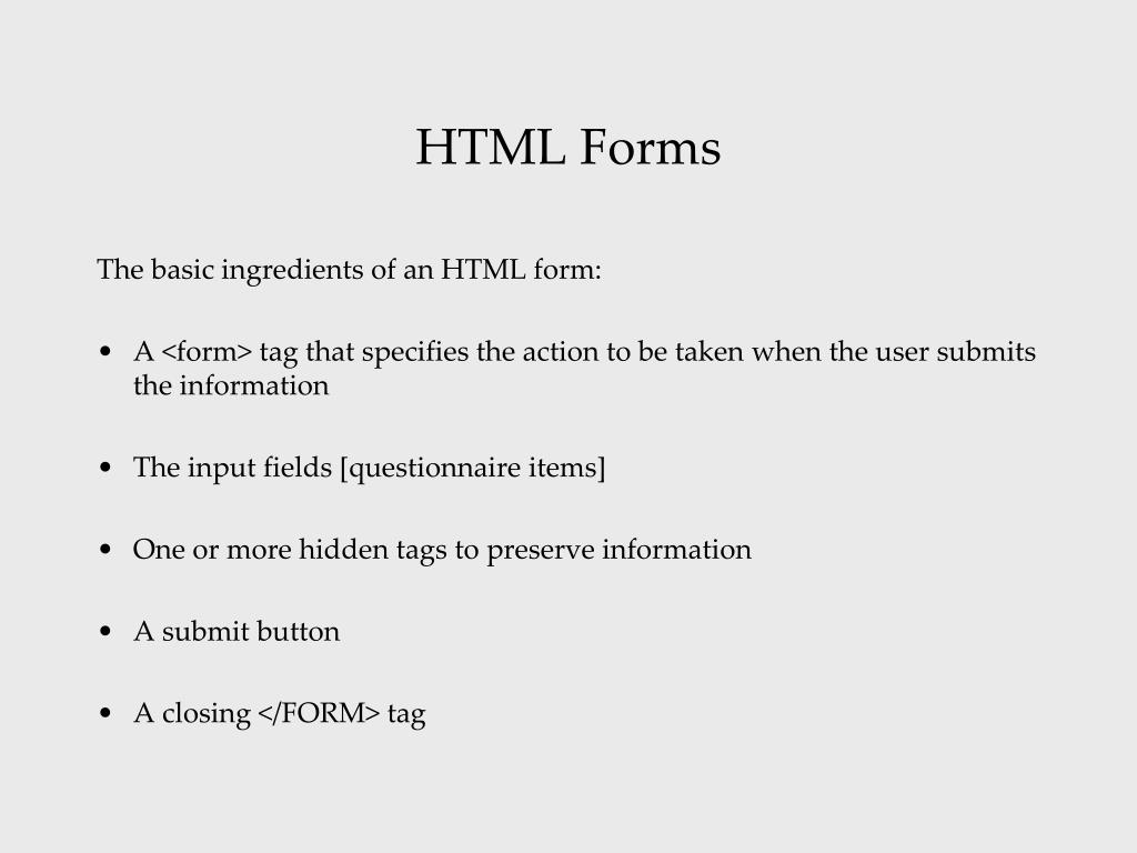 HTML Forms The basic ingredients of an HTML form: • A <form> tag that specifies the action to be taken when the user submits the information • The input fields [questionnaire items] • One or more hidden tags to preserve information • A submit button • A closing </FORM> tag