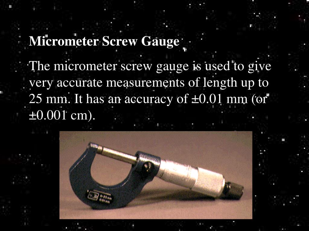 Micrometer Screw Gauge The micrometer screw gauge is used to give very accurate measurements of length up to 25 mm. It has an accuracy of ±0.01 mm (or ±0.001 cm).