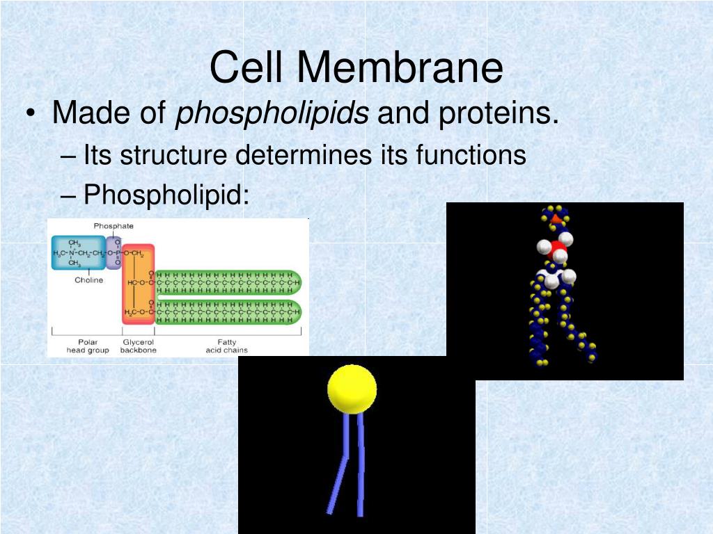 Cell Membrane • Made of phospholipids and proteins. • Its structure determines its functions • Phospholipid: