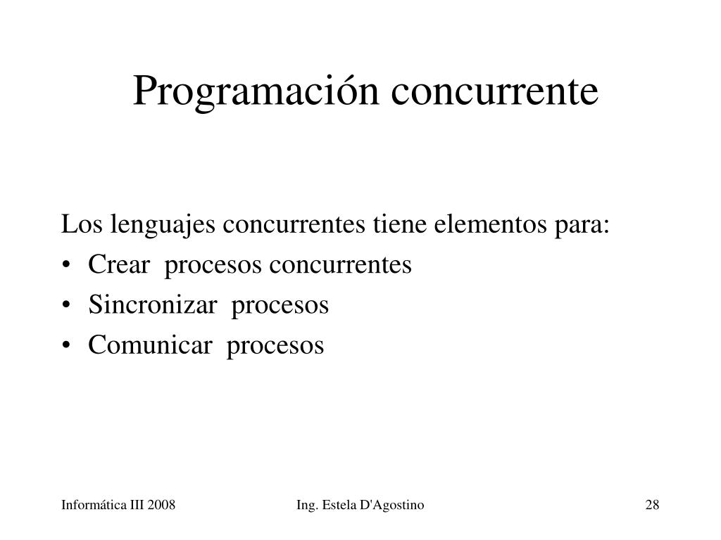 Programación concurrente Los lenguajes concurrentes tiene elementos para: • Crear procesos concurrentes • Sincronizar procesos • Comunicar procesos Ing. Estela D'Agostino