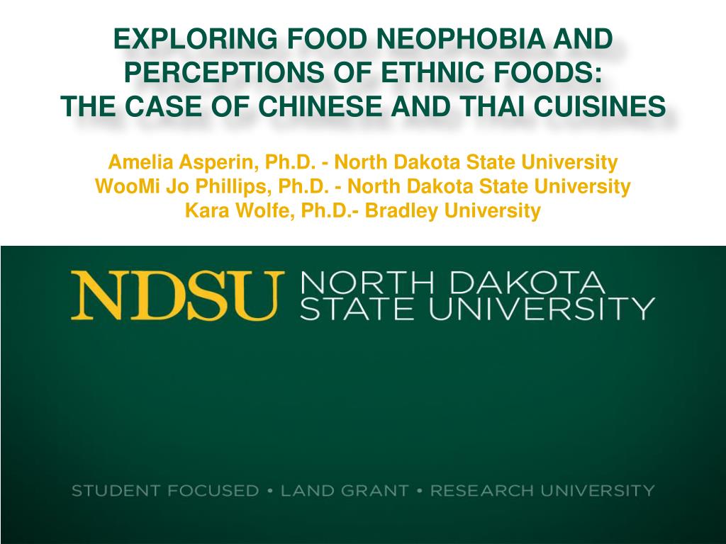 Exploring Food Neophobia and Perceptions of Ethnic Foods: The Case of Chinese and Thai Cuisines. Amelia Asperin, Ph.D. - North Dakota State University WooMi Jo Phillips, Ph.D. - North Dakota State University Kara Wolfe, Ph.D.- Bradley University. INTRODUCTION. Purpose