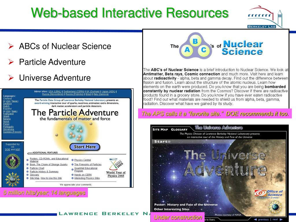Web-based Interactive Resources • ABCs of Nuclear Science • Particle Adventure • Universe Adventure The APS calls it a “favorite site.” DOE recommends it too. 5 million hits/year; 14 languages Under construction