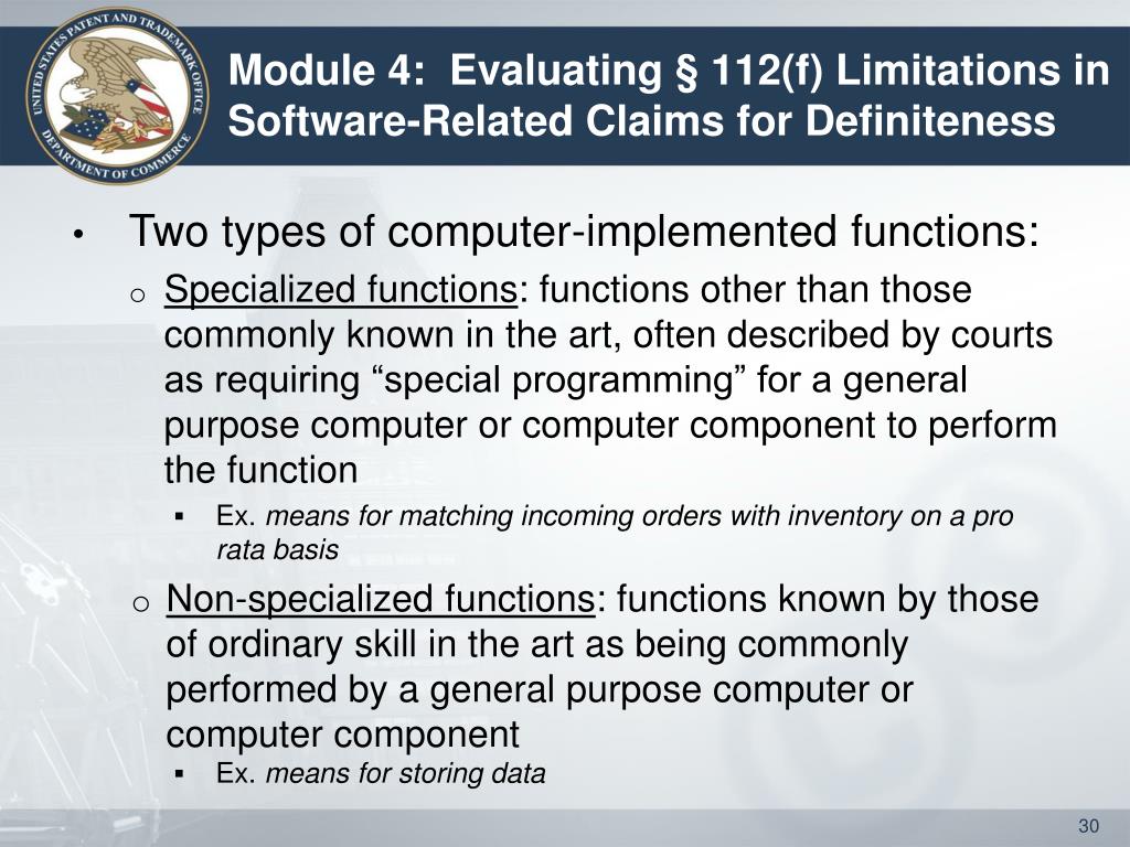 Module 4: Evaluating § 112(f) Limitations in Software-Related Claims for Definiteness • Two types of computer-implemented functions: • Specialized functions: functions other than those commonly known in the art, often described by courts as requiring “special programming” for a general purpose computer or computer component to perform the function • Ex. means for matching incoming orders with inventory on a pro rata basis • Non-specialized functions: functions known by those of ordinary skill in the art as being commonly performed by a general purpose computer or computer component • Ex. means for storing data