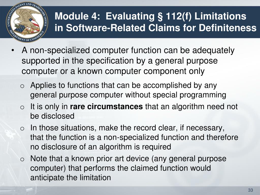 Module 4: Evaluating § 112(f) Limitations in Software-Related Claims for Definiteness • A non-specialized computer function can be adequately supported in the specification by a general purpose computer or a known computer componentonly • Applies to functions that can be accomplished by any general purpose computer without special programming • It is only in rare circumstances that an algorithm need not be disclosed • In those situations, make the record clear, if necessary, that the function is a non-specialized function and therefore no disclosure of an algorithm is required • Note that a known prior art device (any general purpose computer) that performs the claimed function would anticipate the limitation