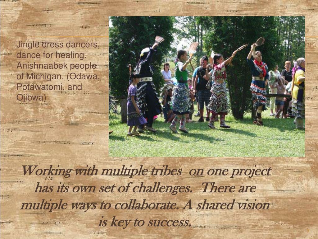 Jingle dress dancers, dance for healing. Anishnaabek people of Michigan. (Odawa, Potawatomi, and Ojibwa) Working with multiple tribes on one project has its own set of challenges. There are multiple ways to collaborate. A shared vision is key to success.