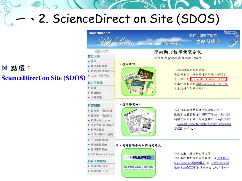 一、2. ScienceDirect on Site (SDOS) • 點選: ScienceDirect on Site (SDOS)