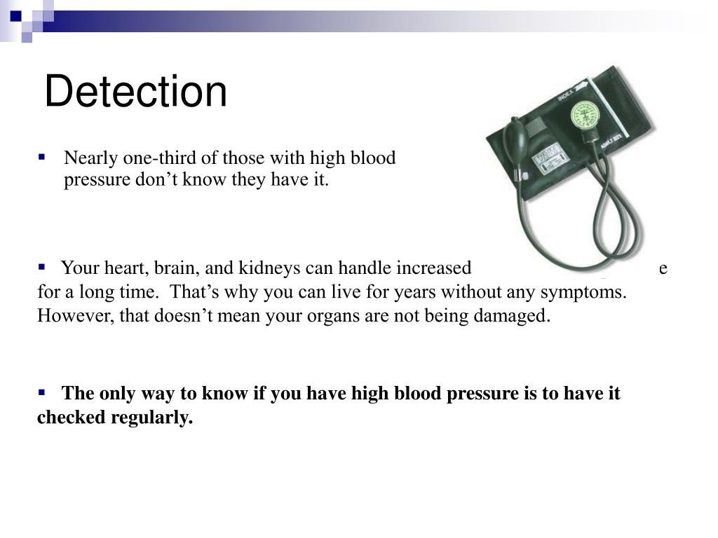 Detection • Nearly one-third of those with high blood pressure don’t know they have it. • Your heart, brain, and kidneys can handle increased pressure for a long time. That’s why you can live for years without any symptoms. However, that doesn’t mean your organs are not being damaged. • The only way to know if you have high blood pressure is to have it checked regularly.