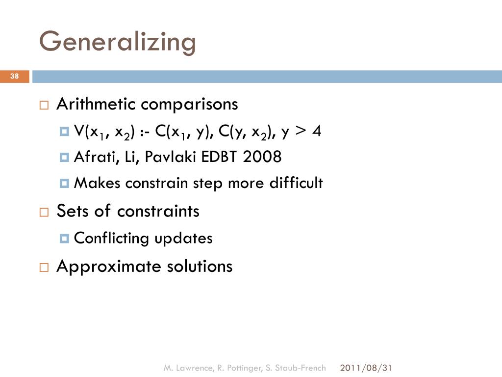 Generalizing • Arithmetic comparisons • V(x1, x2) :- C(x1, y), C(y, x2), y > 4 • Afrati, Li, Pavlaki EDBT 2008 • Makes constrain step more difficult • Sets of constraints • Conflicting updates • Approximate solutions M. Lawrence, R. Pottinger, S. Staub-French