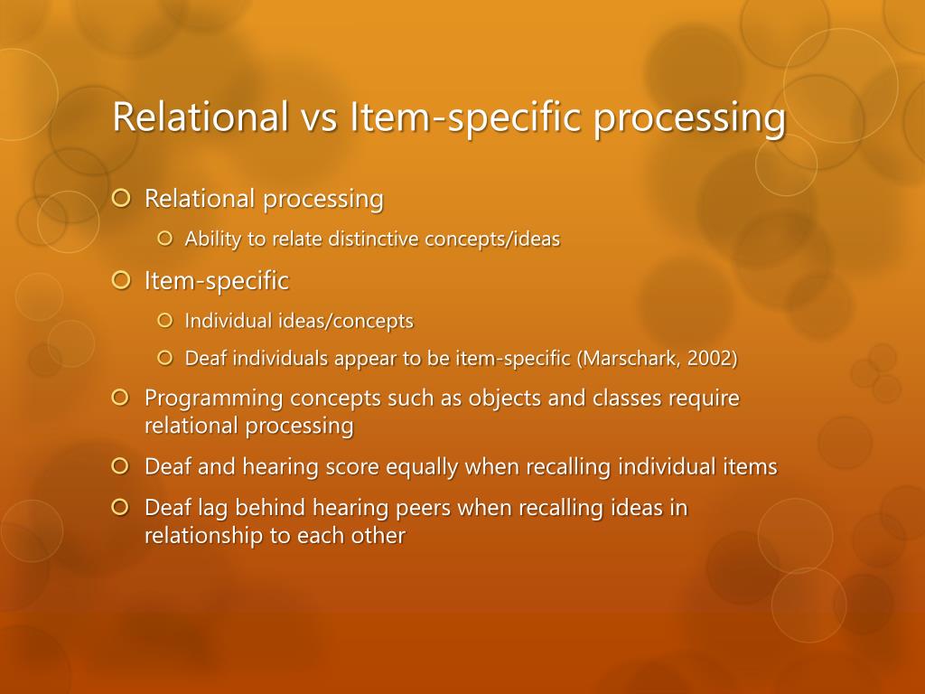 Relational vs Item-specific processing • Relational processing • Ability to relate distinctive concepts/ideas • Item-specific • Individual ideas/concepts • Deaf individuals appear to be item-specific (Marschark, 2002) • Programming concepts such as objects and classes require relational processing • Deaf and hearing score equally when recalling individual items • Deaf lag behind hearing peers when recalling ideas in relationship to each other