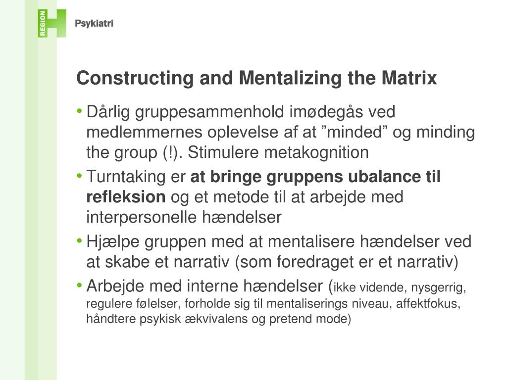 Constructing and Mentalizing the Matrix • Dårlig gruppesammenhold imødegås ved medlemmernes oplevelse af at ”minded” og minding the group (!). Stimulere metakognition • Turntaking er at bringe gruppens ubalance til refleksion og et metode til at arbejde med interpersonelle hændelser • Hjælpe gruppen med at mentalisere hændelser ved at skabe et narrativ (som foredraget er et narrativ) • Arbejde med interne hændelser (ikke vidende, nysgerrig, regulere følelser, forholde sig til mentaliserings niveau, affektfokus, håndtere psykisk ækvivalens og pretend mode)