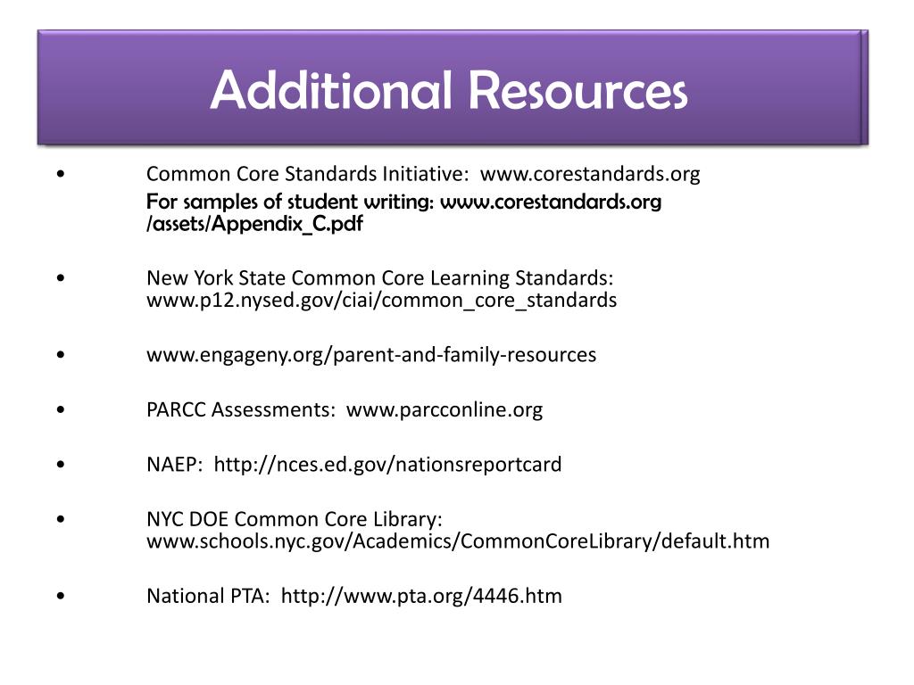 Additional Resources Additional Resources • Common Core Standards Initiative: www.corestandards.org For samples of student writing: www.corestandards.org /assets/Appendix_C.pdf • New York State Common Core Learning Standards: www.p12.nysed.gov/ciai/common_core_standards •www.engageny.org/parent-and-family-resources • PARCC Assessments: www.parcconline.org • NAEP: http://nces.ed.gov/nationsreportcard • NYC DOE Common Core Library: www.schools.nyc.gov/Academics/CommonCoreLibrary/default.htm • National PTA: http://www.pta.org/4446.htm
