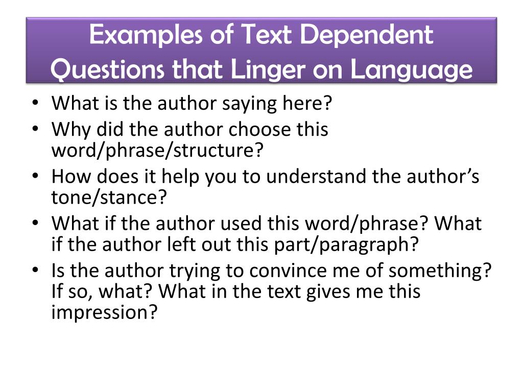 Examples of Text Dependent Questions that Linger on Language • What is the author saying here? • Why did the author choose this word/phrase/structure? • How does it help you to understand the author’s tone/stance? • What if the author used this word/phrase? What if the author left out this part/paragraph? • Is the author trying to convince me of something? If so, what? What in the text gives me this impression?