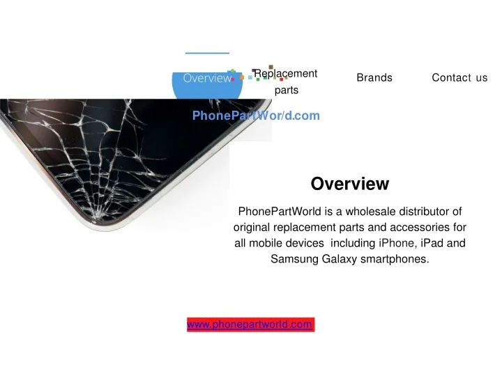 -·...·..·...PhonePartWor/d.com Replacement parts Brands Contactus Overview PhonePartWorld is a wholesale distributor of original replacement parts and accessories for all mobile devices including iPhone, iPad and Samsung Galaxy smartphones. www.phonepartworld.com