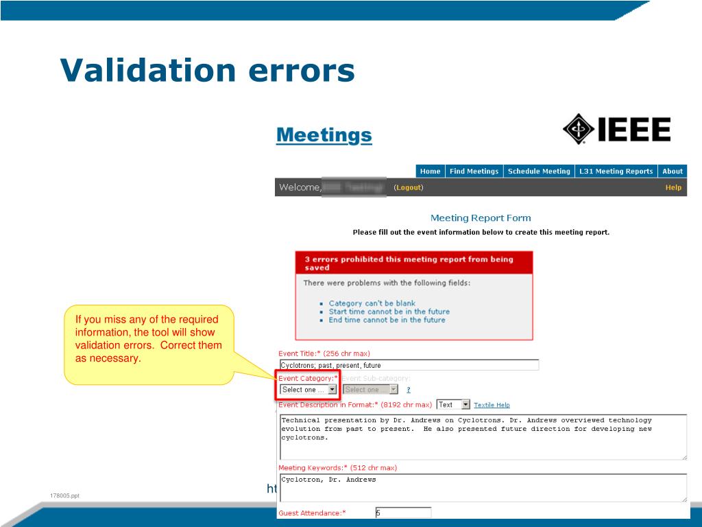 Create an L31 report from an existing meeting notice 6 You only need to enter the number of guests and IEEE members who attended the meeting. Click on “Create” to create the report.