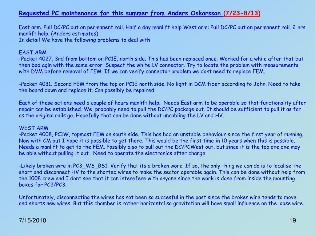 Requested PC maintenance for this summer from Anders Oskarsson (7/23-8/13) East arm. Pull DC/PC out on permanent rail. Half a day manlift help West arm: Pull DC/PC out on permanent rail. 2 hrs manlift help. (Anders estimates) In detail We have the following problems to deal with: EAST ARM -Packet 4027, 3rd from bottom on PC1E, north side. This has been replaced once. Worked for a while after that but then bad agin with the same error. Suspect the white LV connector. Try to locate the problem with measurements with DVM before removal of FEM. If we can verify connector problem we dont need to replace FEM. -Packet 4031. Second FEM from the top on PC1E north side. No light in DCM fiber according to John. Need to take the board down and replace it. Can possibly be repaired. Each of these actions need a couple of hours manlift help. Needs East arm to be operable so that functionality after repair can be established. We probably need to pull the DC/PC package out. It should be sufficient to pull it as far as the original rails go. Hopefully that can be done without uncabling the LV and HV. WEST ARM -Packet 4008, PC1W, topmost FEM on south side. This has had an unstable behaviour since the first year of running. Now with CM out I hope it is possible to get there. This would be the first time in 10 years when this is possible. Needs a manlift to get to the FEM. Possibly also to pull out the DC/PCWest out, but since it is the top one one may be able without pulling it out . Need to operate the electronics after change. -Likely broken wire in PC3_WS_BS1. Verify that its a broken wore. If so, the only thing we can do is to localise the short and disconnect HV to the shorted wires to make the sector operable again. This can be done without help from the 1008 crew and I dont see that it can interefere with anyone since the work is done from inside the mounting boxes for PC2/PC3. Unfortunately, disconnecting the wires has not been so succesful in the past since the broken wire tends to move and shorts new wires. But this chamber is rather horizontal so gravitation will have small influence on the loose wire.