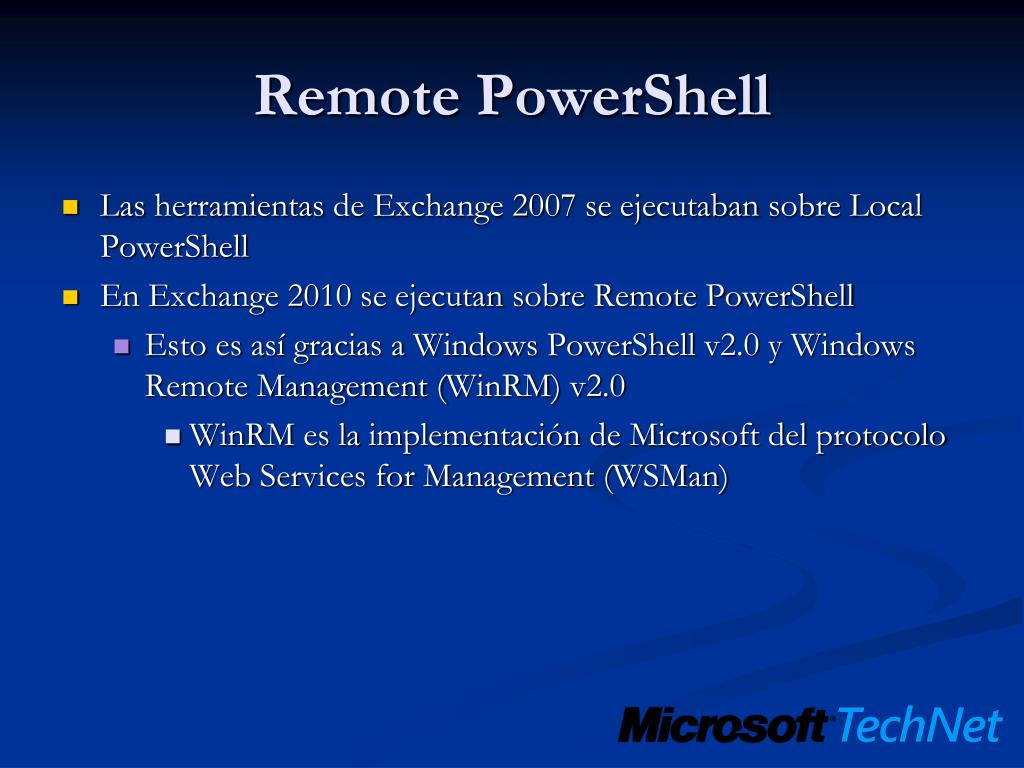 Remote PowerShell • Las herramientas de Exchange 2007 se ejecutabansobre Local PowerShell • En Exchange 2010 se ejecutansobre Remote PowerShell • Estoesasí gracias a Windows PowerShell v2.0 y Windows Remote Management (WinRM) v2.0 • WinRMes la implementación de Microsoft del protocolo Web Services for Management (WSMan)