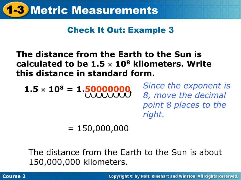 Check It Out: Example 3 The distance from the Earth to the Sun is calculated to be 1.5 108 kilometers. Write this distance in standard form. Since the exponent is 8, move the decimal point 8 places to the right. 1.5 108 = 1.50000000 = 150,000,000 The distance from the Earth to the Sun is about 150,000,000 kilometers.