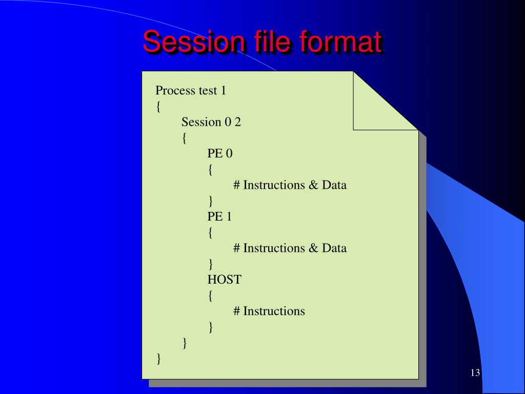 Process test 1 { Session 0 2 { PE 0 { # Instructions & Data } PE 1 { # Instructions & Data } HOST { # Instructions } } } Session file format