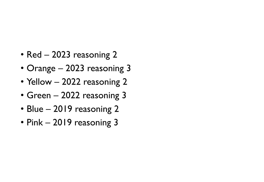 • Red – 2023 reasoning 2 • Orange – 2023 reasoning 3 • Yellow – 2022 reasoning 2 • Green – 2022 reasoning 3 • Blue – 2019 reasoning 2 • Pink – 2019 reasoning 3