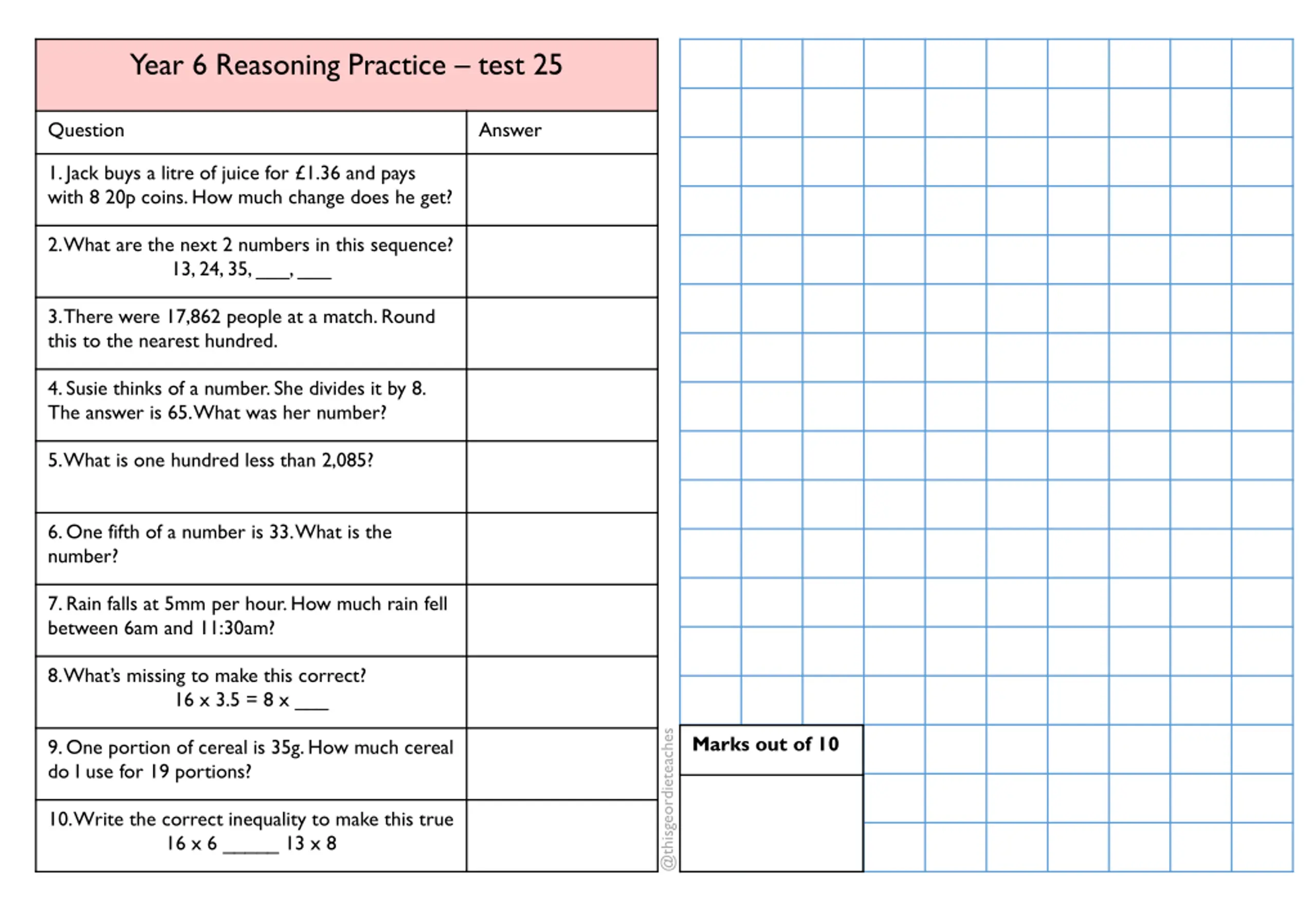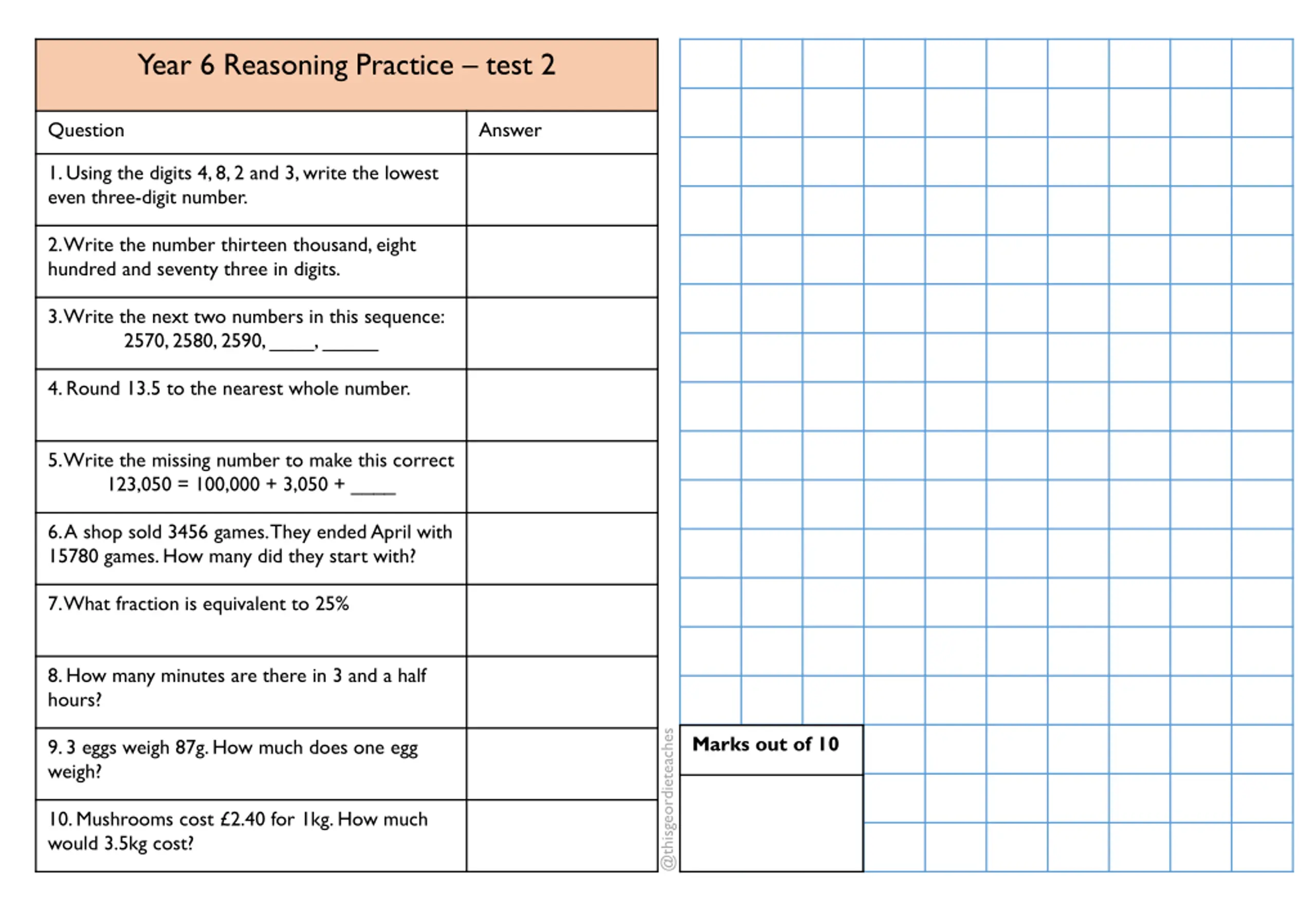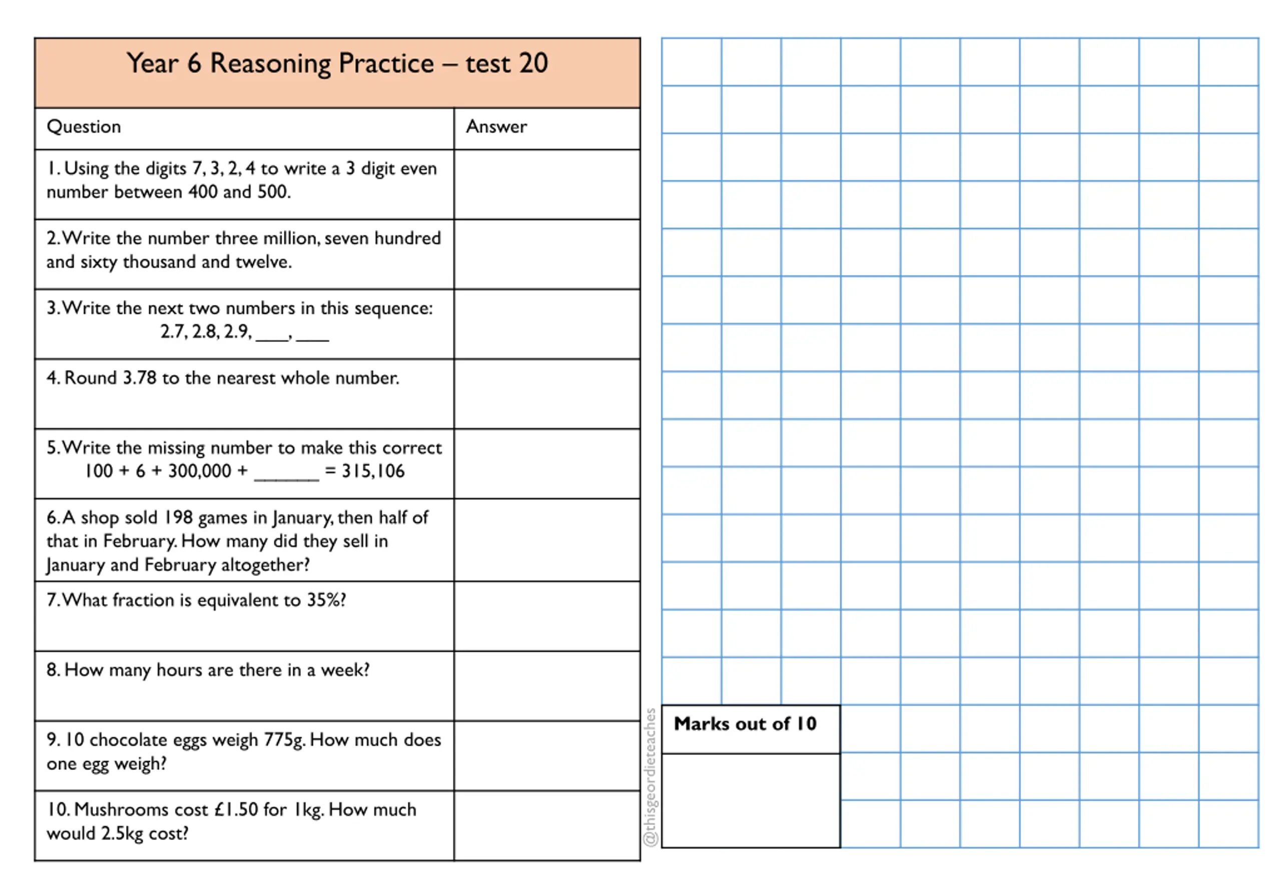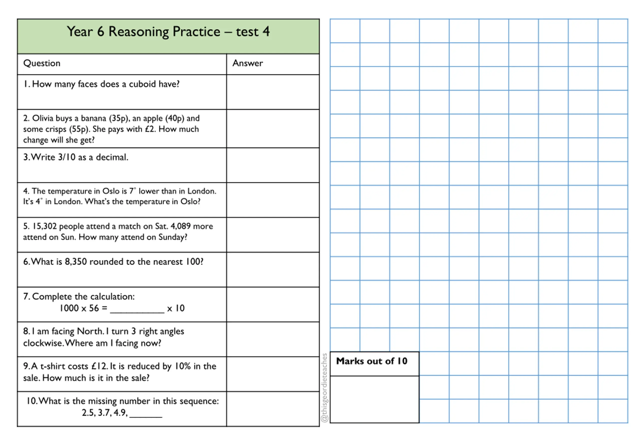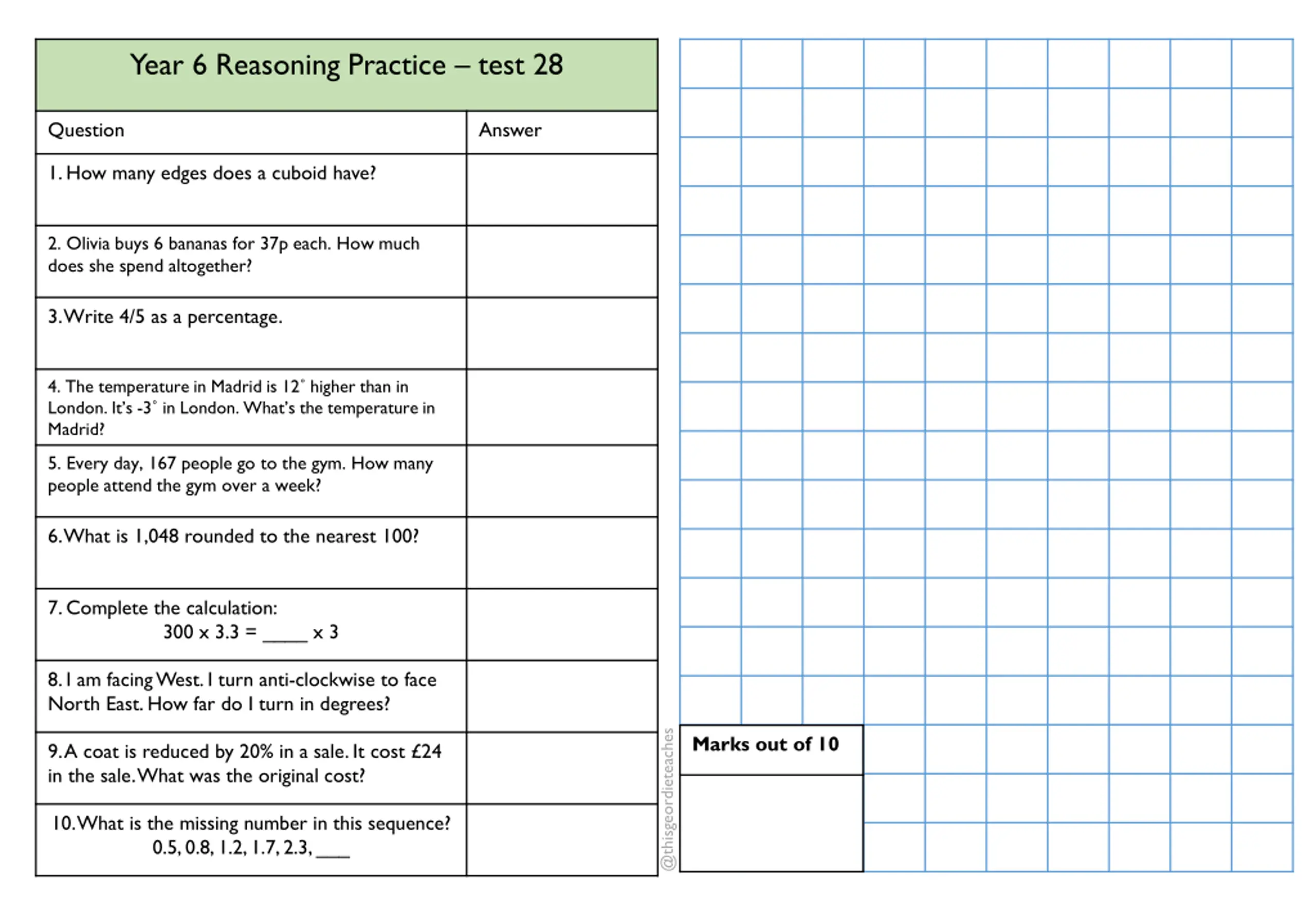 Year 6 Reasoning Practice – test 28 Question Answer 1. How many edges does a cuboid have? 2. Olivia buys 6 bananas for 37p each. How much does she spend altogether? 3. Write 4/5 as a percentage. 4. The temperature in Madrid is 12˚ higher than in London. It’s -3˚ in London. What’s the temperature in Madrid? 5. Every day, 167 people go to the gym. How many people attend the gym over a week? 6. What is 1,048 rounded to the nearest 100? 7. Complete the calculation: 300 x 3.3 = ____ x 3 8. I am facing West. I turn anti-clockwise to face North East. How far do I turn in degrees? @thisgeordieteaches Marks out of 10 9. A coat is reduced by 20% in a sale. It cost £24 in the sale. What was the original cost? 10. What is the missing number in this sequence? 0.5, 0.8, 1.2, 1.7, 2.3, ___