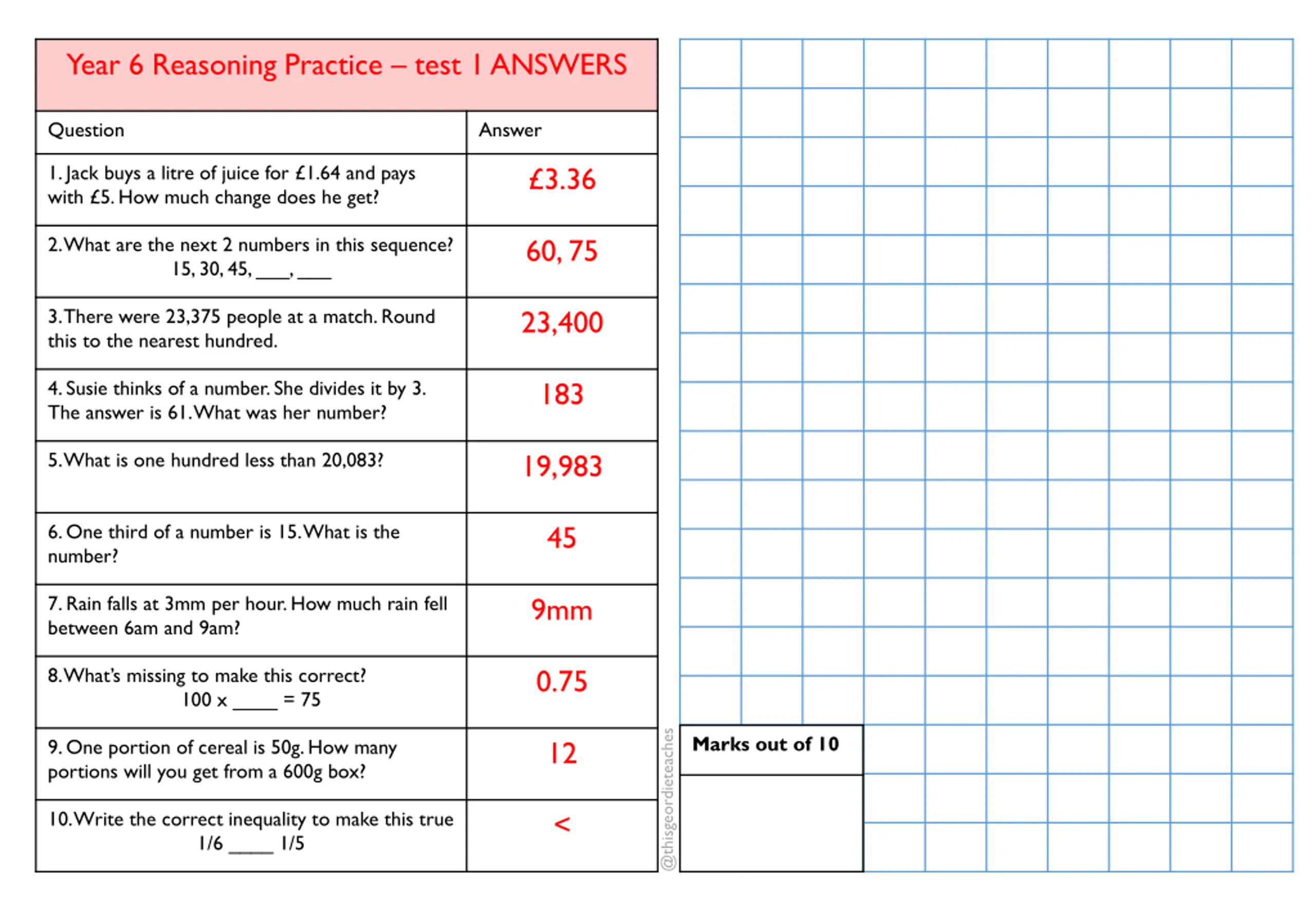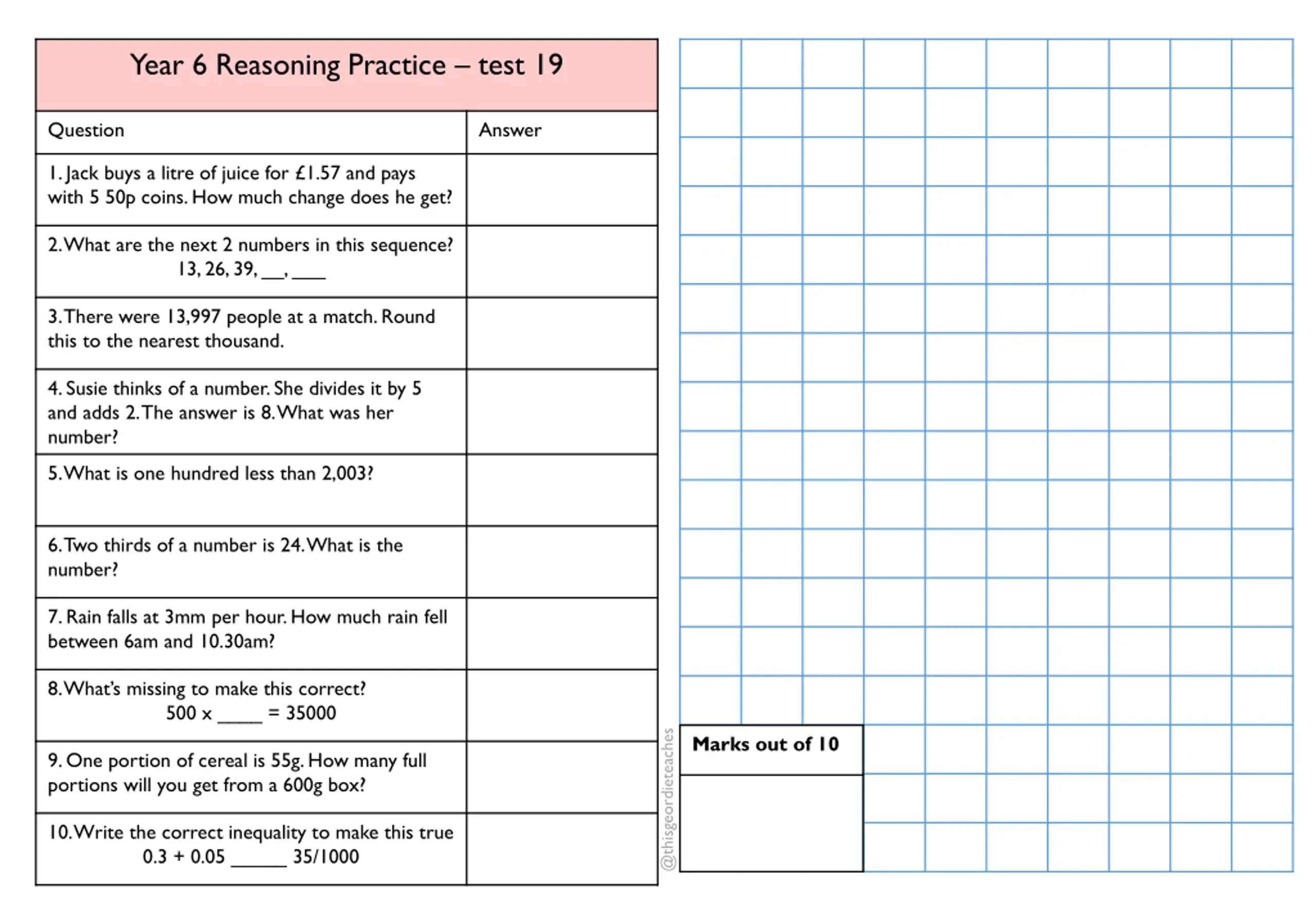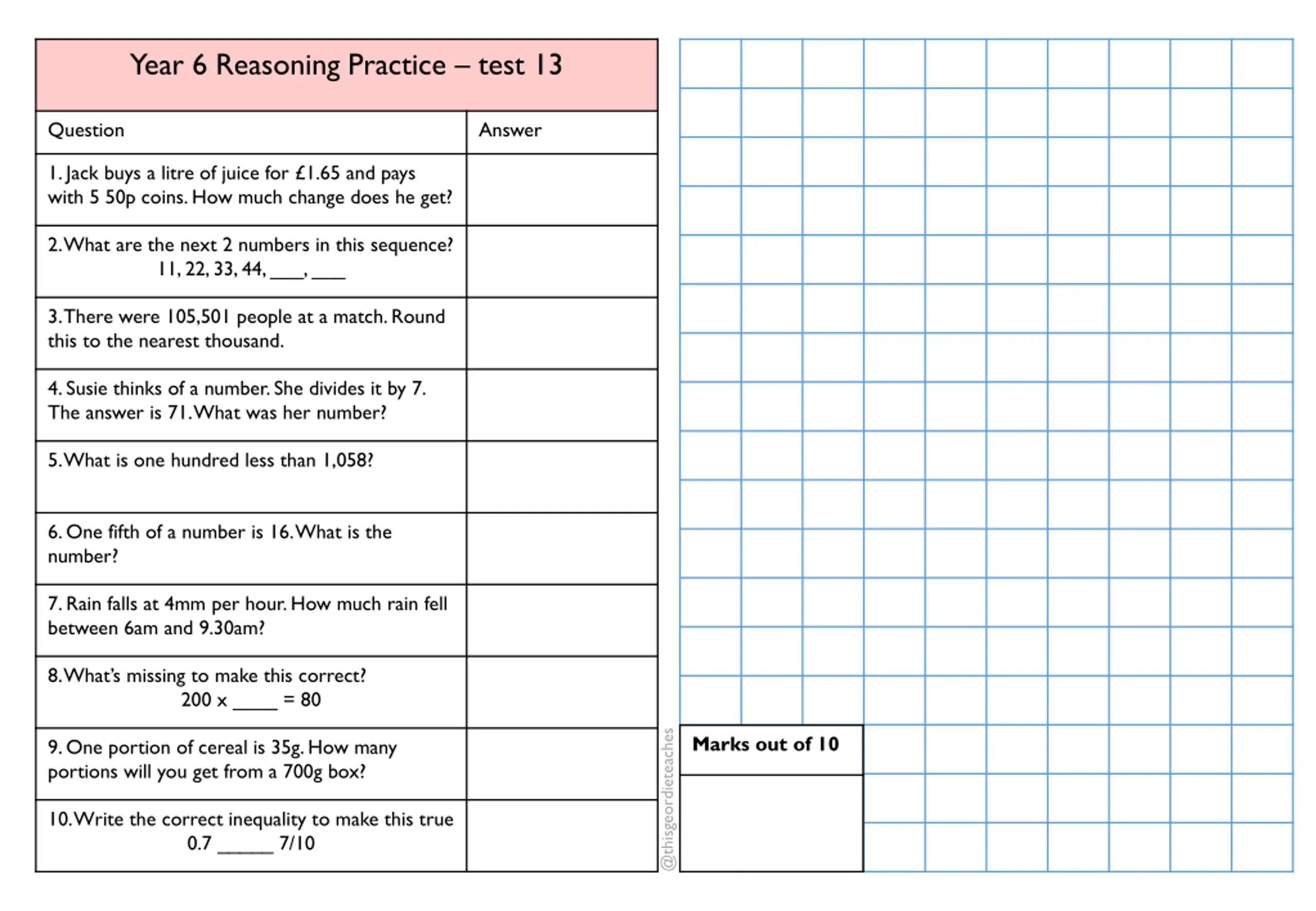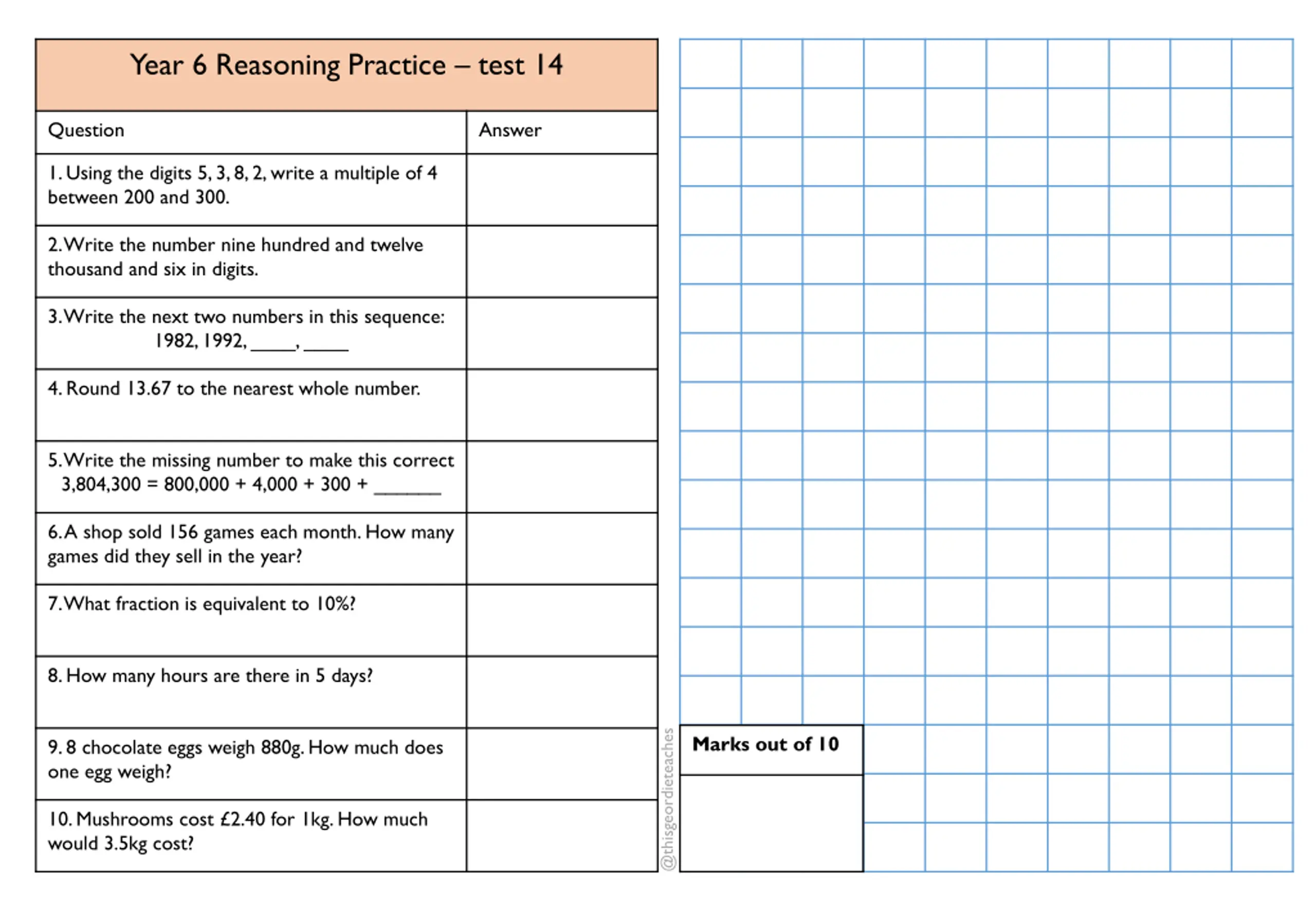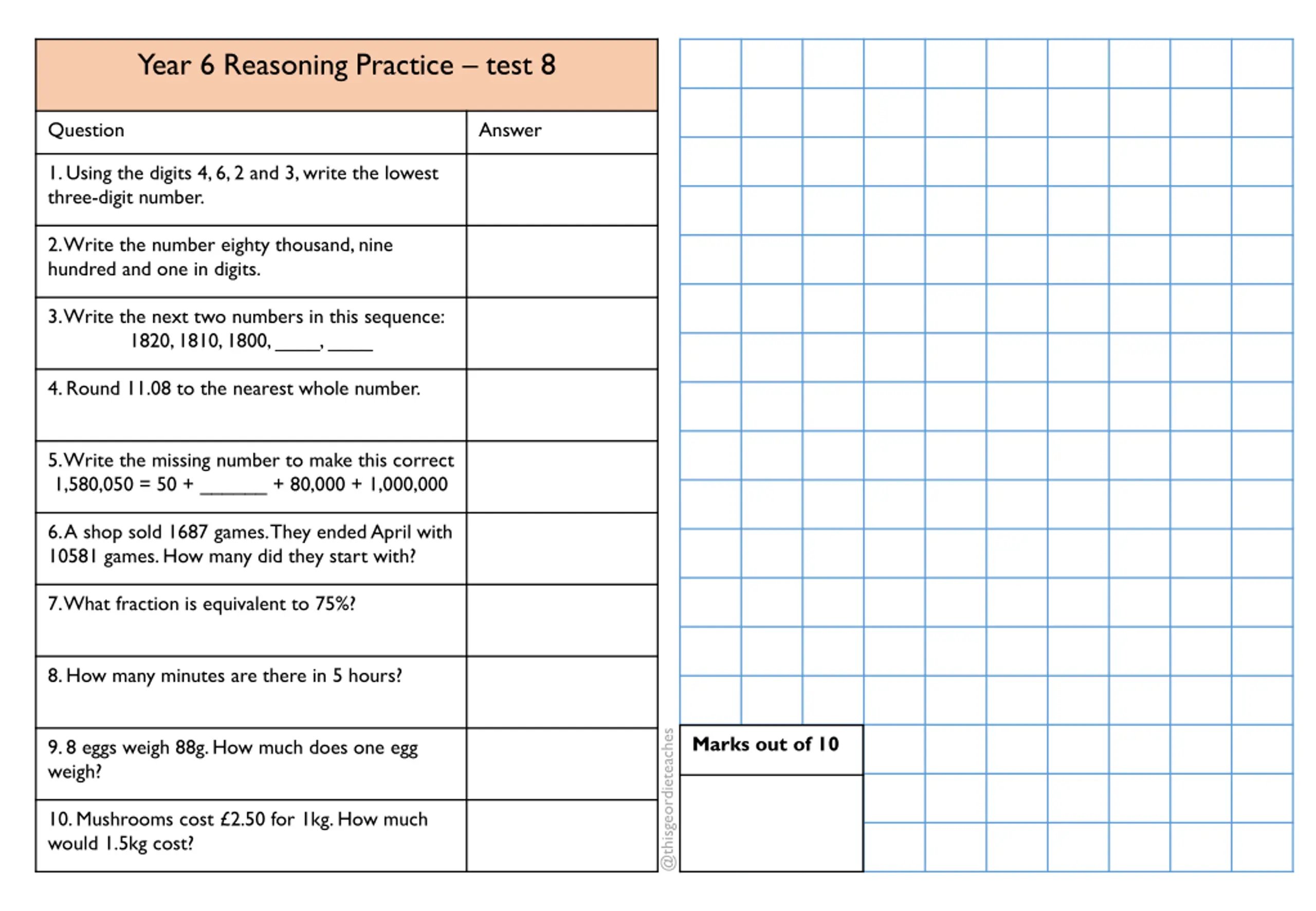 Year 6 Reasoning Practice – test 28 Question Answer 1. How many edges does a cuboid have? 2. Olivia buys 6 bananas for 37p each. How much does she spend altogether? 3. Write 4/5 as a percentage. 4. The temperature in Madrid is 12˚ higher than in London. It’s -3˚ in London. What’s the temperature in Madrid? 5. Every day, 167 people go to the gym. How many people attend the gym over a week? 6. What is 1,048 rounded to the nearest 100? 7. Complete the calculation: 300 x 3.3 = ____ x 3 8. I am facing West. I turn anti-clockwise to face North East. How far do I turn in degrees? @thisgeordieteaches Marks out of 10 9. A coat is reduced by 20% in a sale. It cost £24 in the sale. What was the original cost? 10. What is the missing number in this sequence? 0.5, 0.8, 1.2, 1.7, 2.3, ___