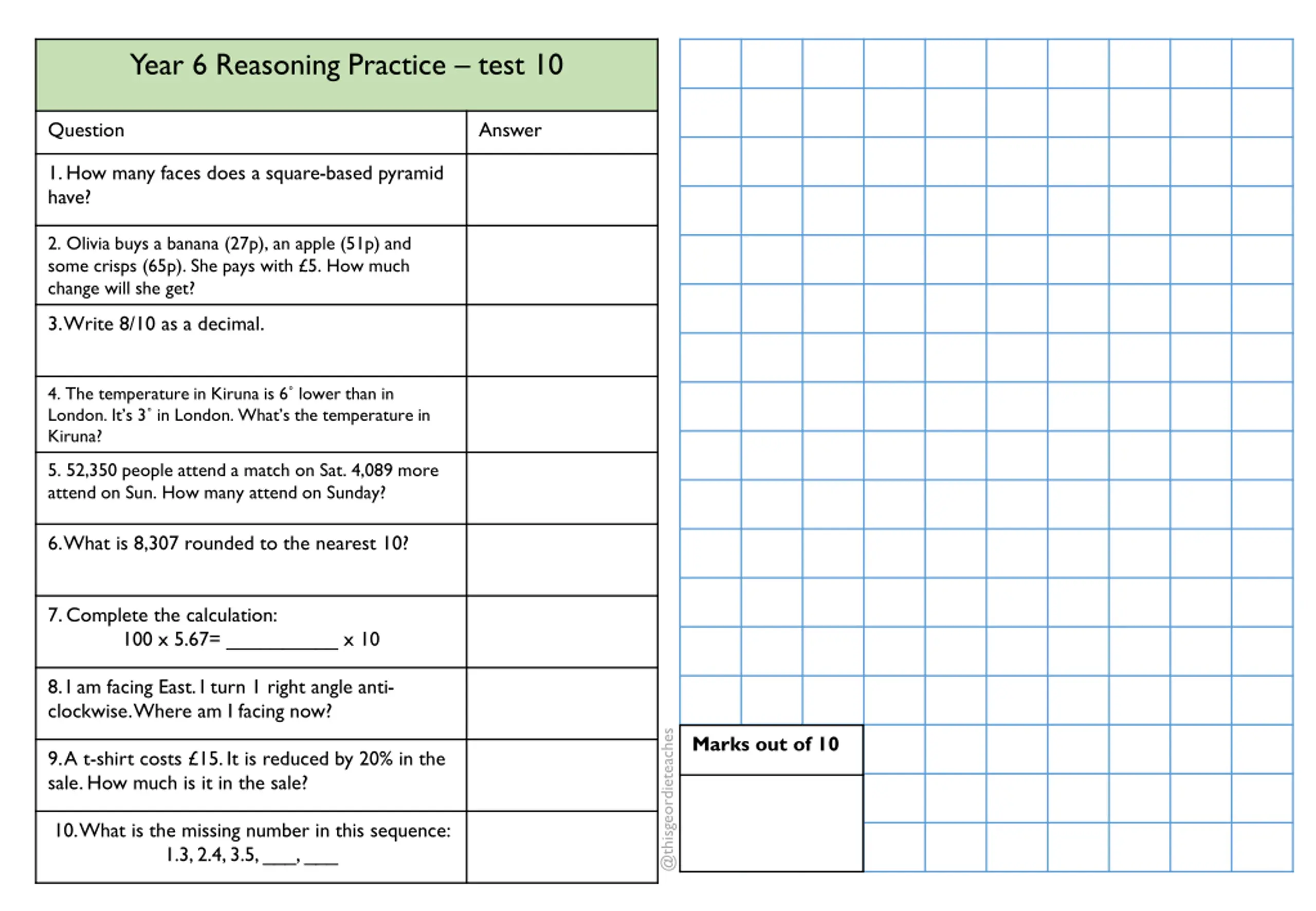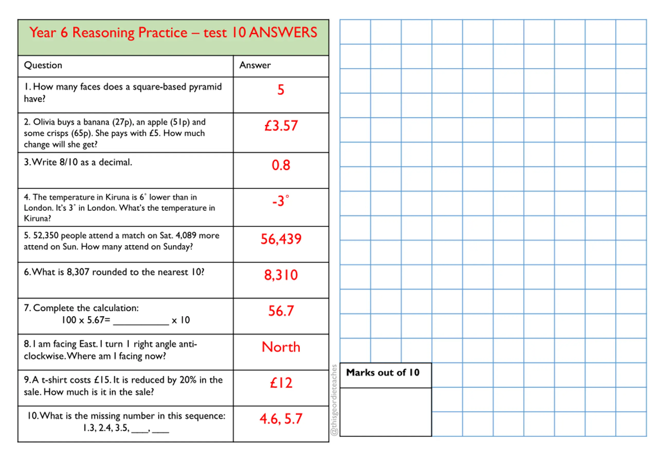 Year 6 Reasoning Practice – test 10 Question Answer 1. How many faces does a square-based pyramid have? 2. Olivia buys a banana (27p), an apple (51p) and some crisps (65p). She pays with £5. How much change will she get? 3. Write 8/10 as a decimal. 4. The temperature in Kiruna is 6˚ lower than in London. It’s 3˚ in London. What’s the temperature in Kiruna? 5. 52,350 people attend a match on Sat. 4,089 more attend on Sun. How many attend on Sunday? 6. What is 8,307 rounded to the nearest 10? 7. Complete the calculation: 100 x 5.67= __________ x 10 8. I am facing East. I turn 1 right angle anti- clockwise. Where am I facing now? @thisgeordieteaches Marks out of 10 9. A t-shirt costs £15. It is reduced by 20% in the sale. How much is it in the sale? 10. What is the missing number in this sequence: 1.3, 2.4, 3.5, ___, ___