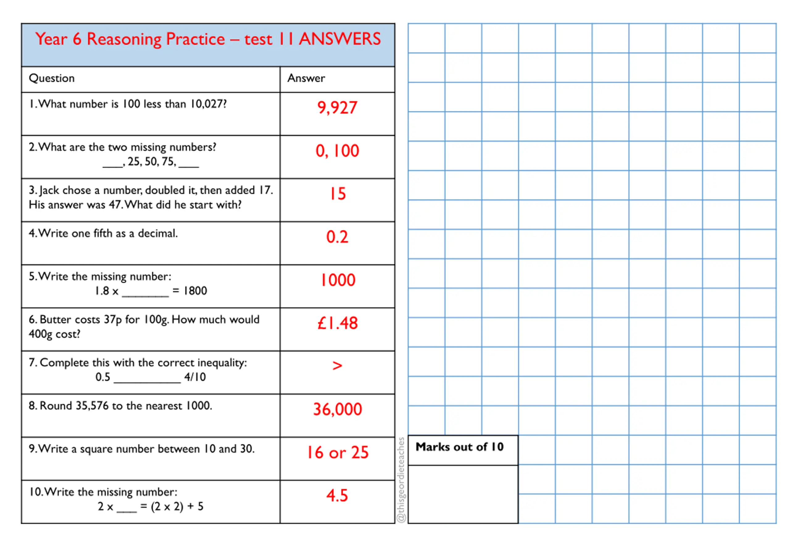 Year 6 Reasoning Practice – test 11 ANSWERS Question Answer 1. What number is 100 less than 10,027? 9,927 2. What are the two missing numbers? ___, 25, 50, 75, ___ 0, 100 3. Jack chose a number, doubled it, then added 17. His answer was 47. What did he start with? 15 4. Write one fifth as a decimal. 0.2 5. Write the missing number: 1.8 x _______ = 1800 1000 6. Butter costs 37p for 100g. How much would 400g cost? £1.48 7. Complete this with the correct inequality: 0.5 __________ 4/10 > 8. Round 35,576 to the nearest 1000. 36,000 @thisgeordieteaches Marks out of 10 9. Write a square number between 10 and 30. 16 or 25 10. Write the missing number: 2 x ___ = (2 x 2) + 5 4.5