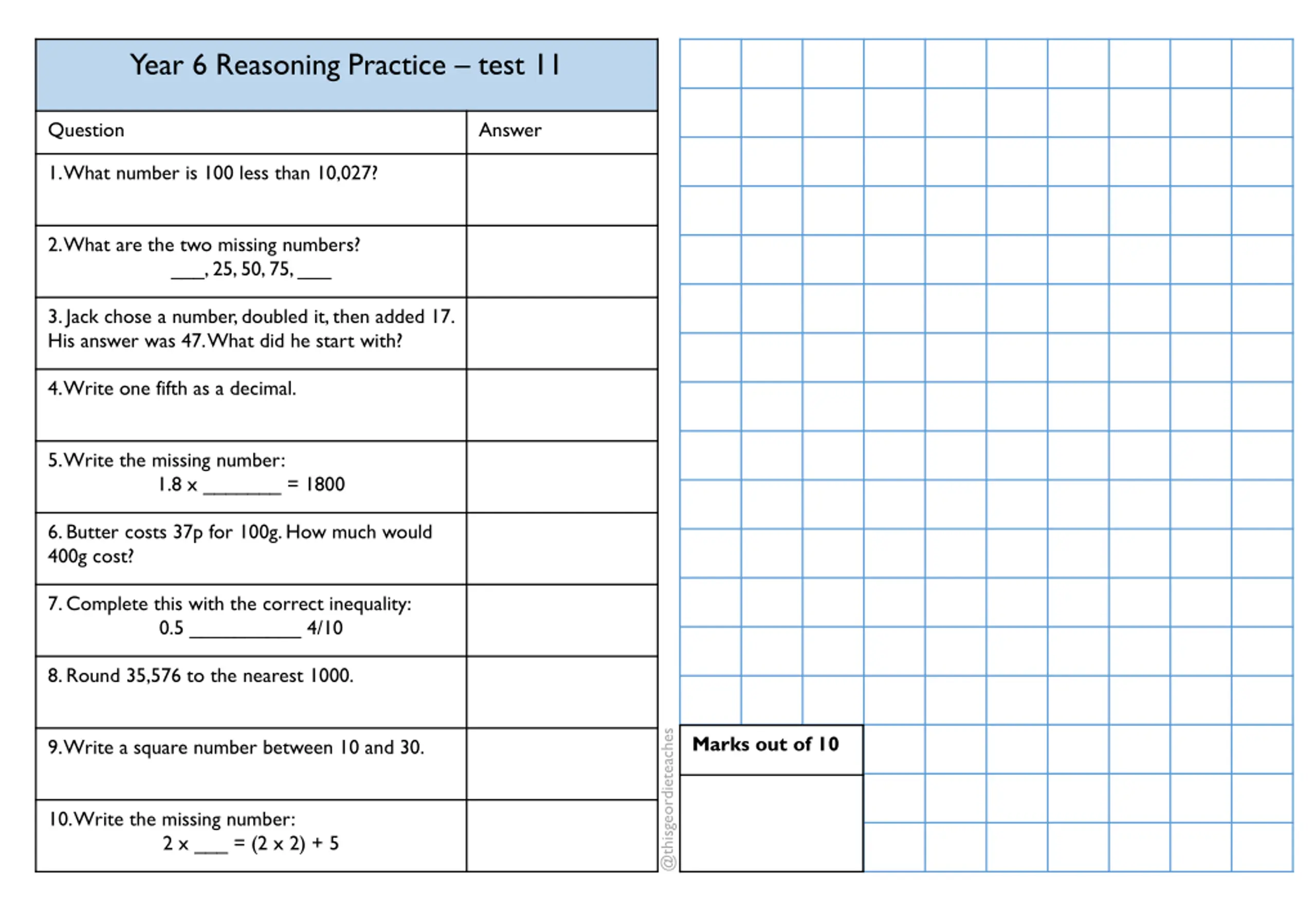 Year 6 Reasoning Practice – test 11 Question Answer 1. What number is 100 less than 10,027? 2. What are the two missing numbers? ___, 25, 50, 75, ___ 3. Jack chose a number, doubled it, then added 17. His answer was 47. What did he start with? 4. Write one fifth as a decimal. 5. Write the missing number: 1.8 x _______ = 1800 6. Butter costs 37p for 100g. How much would 400g cost? 7. Complete this with the correct inequality: 0.5 __________ 4/10 8. Round 35,576 to the nearest 1000. @thisgeordieteaches Marks out of 10 9. Write a square number between 10 and 30. 10. Write the missing number: 2 x ___ = (2 x 2) + 5