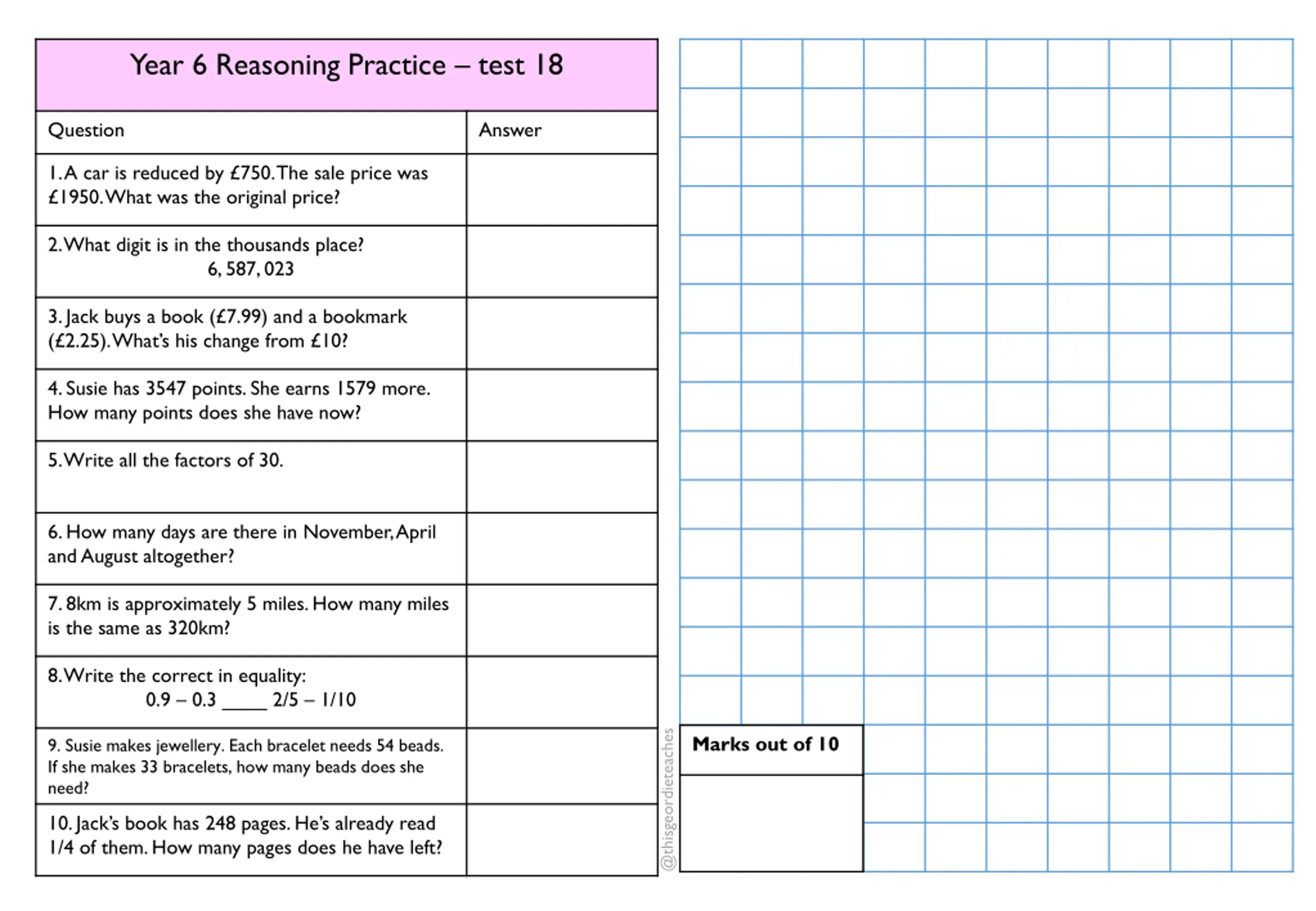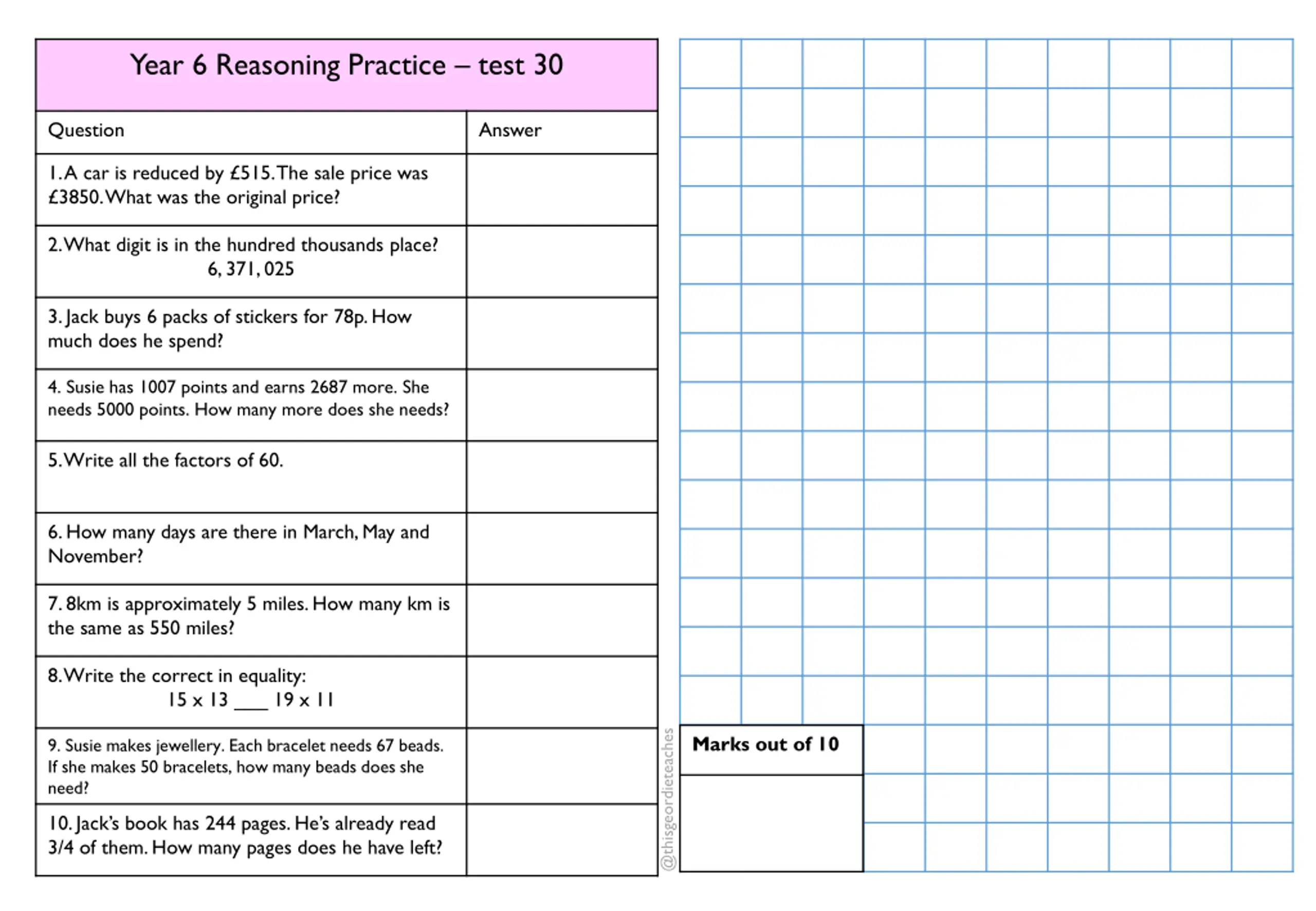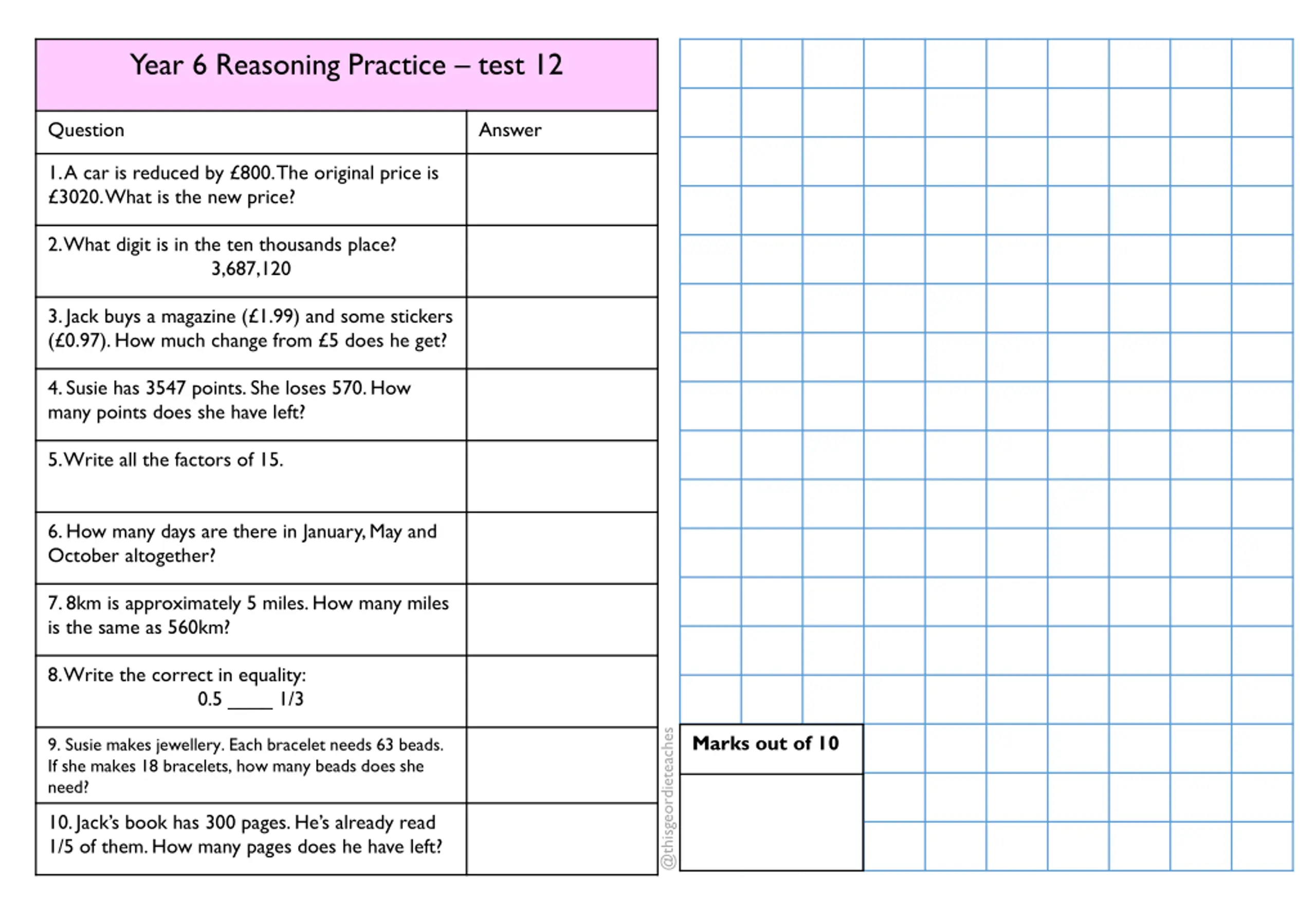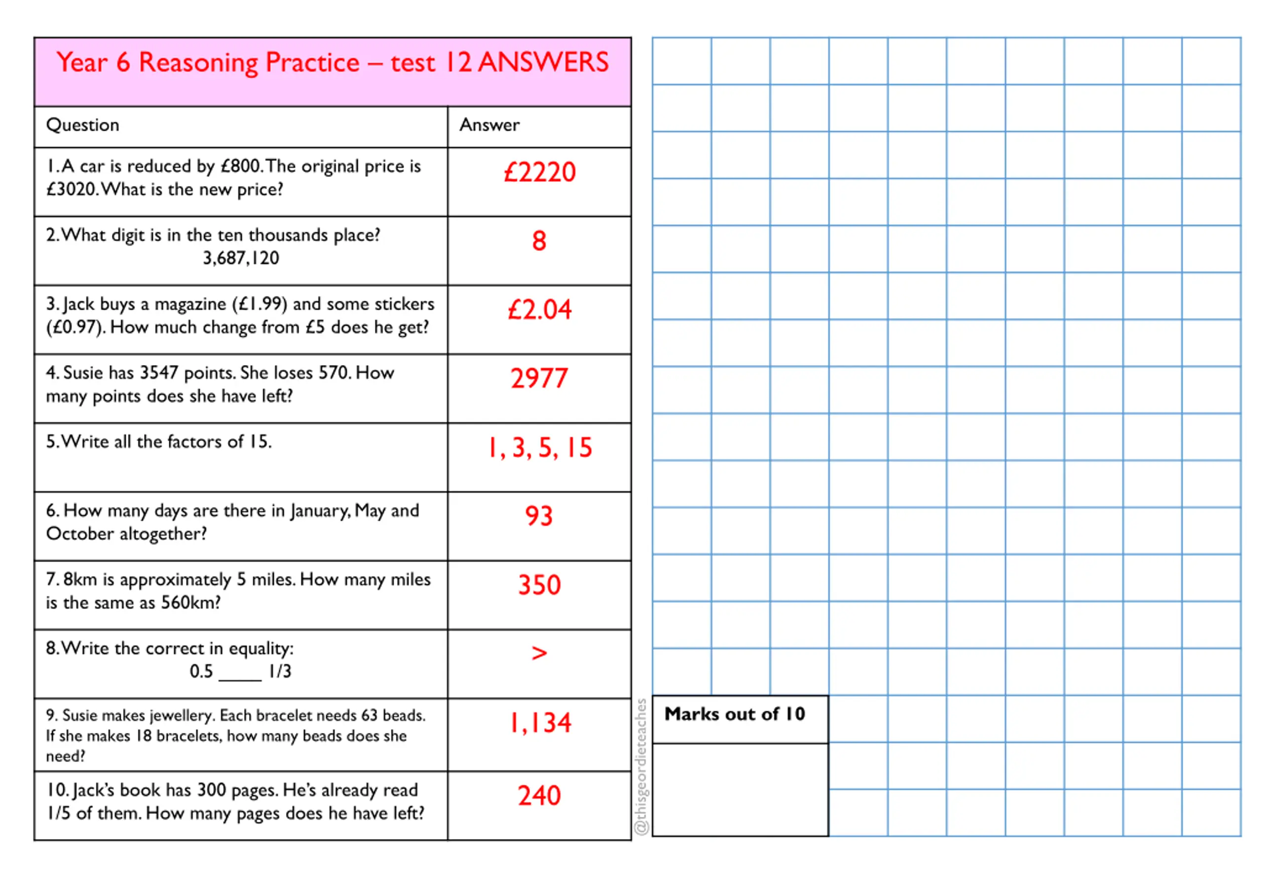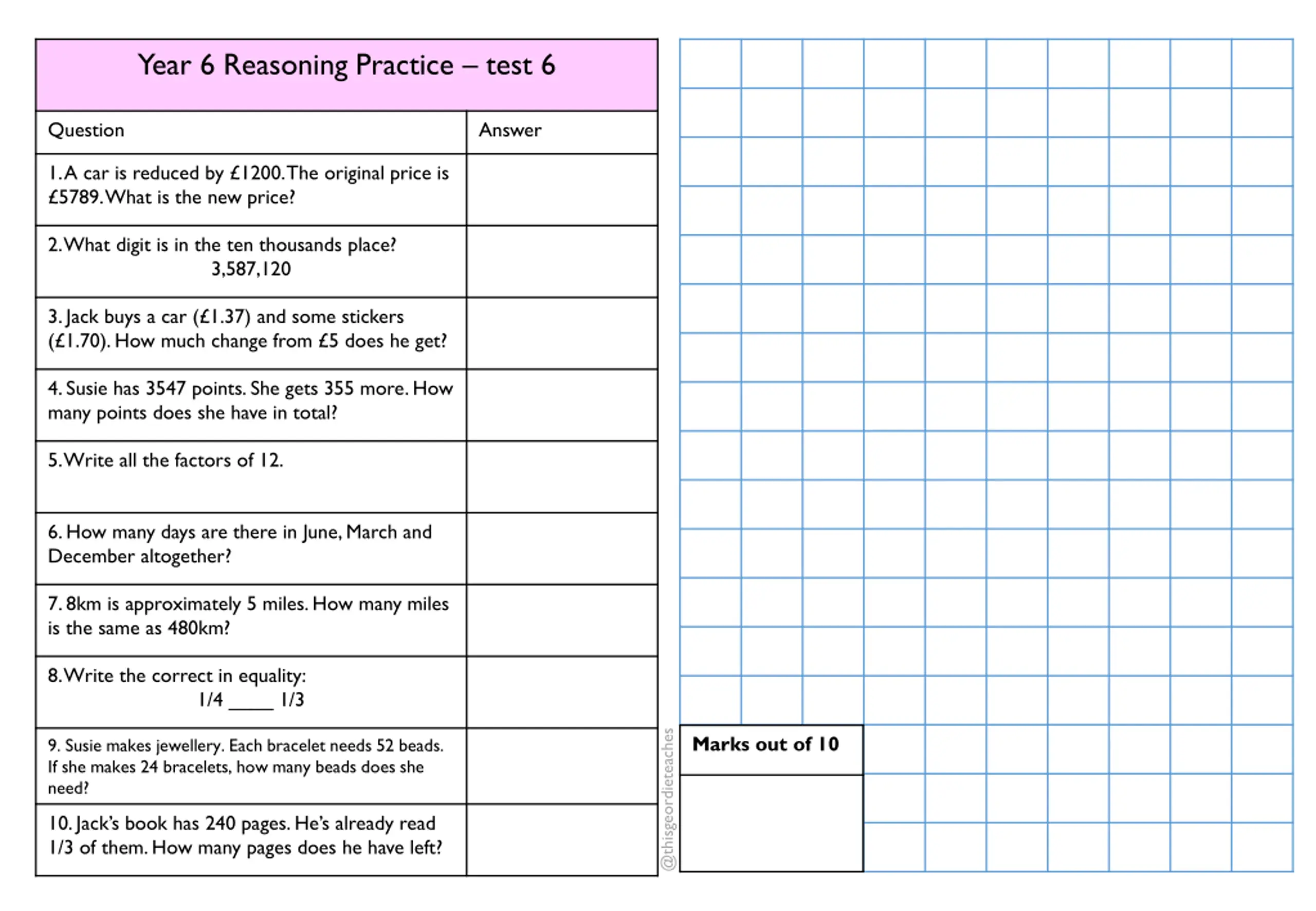 Year 6 Reasoning Practice – test 6 Question Answer 1. A car is reduced by £1200. The original price is £5789. What is the new price? 2. What digit is in the ten thousands place? 3,587,120 3. Jack buys a car (£1.37) and some stickers (£1.70). How much change from £5 does he get? 4. Susie has 3547 points. She gets 355 more. How many points does she have in total? 5. Write all the factors of 12. 6. How many days are there in June, March and December altogether? 7. 8km is approximately 5 miles. How many miles is the same as 480km? 8. Write the correct in equality: 1/4 ____ 1/3 @thisgeordieteaches Marks out of 10 9. Susie makes jewellery. Each bracelet needs 52 beads. If she makes 24 bracelets, how many beads does she need? 10. Jack’s book has 240 pages. He’s already read 1/3 of them. How many pages does he have left?