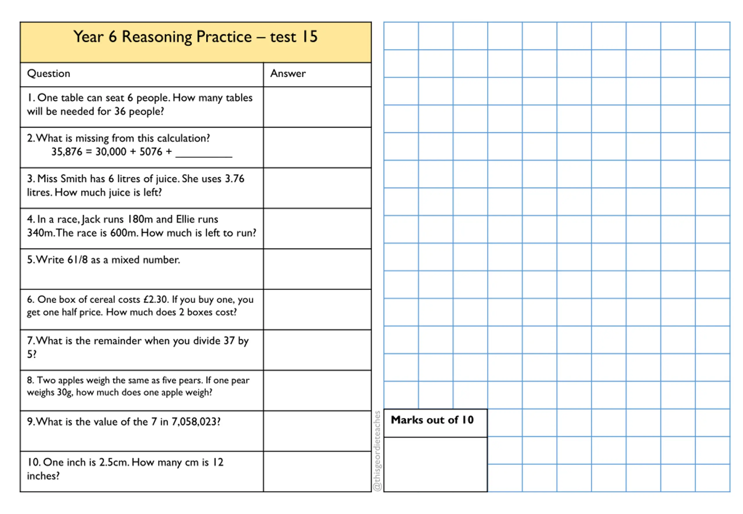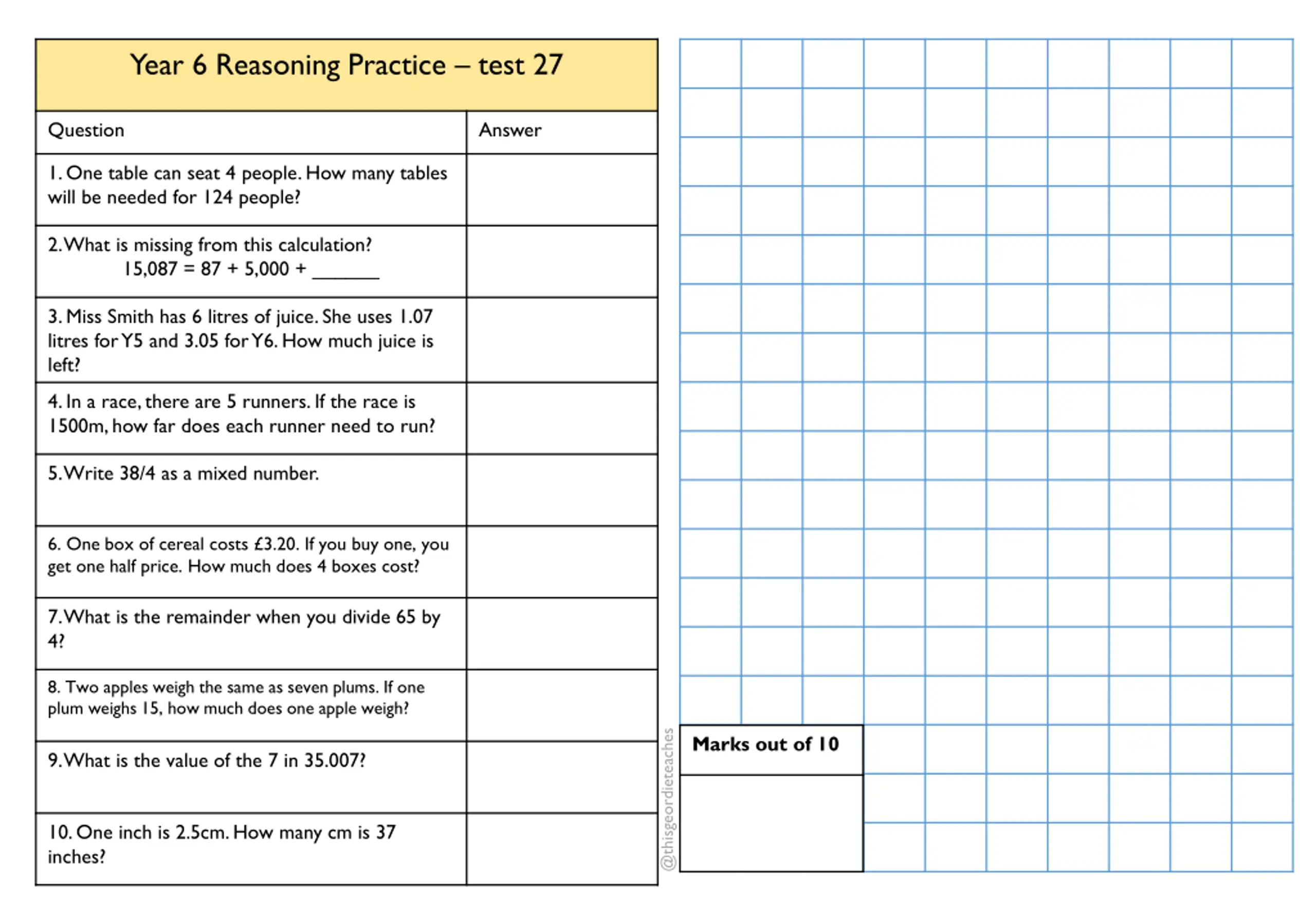 Year 6 Reasoning Practice – test 27 Question Answer 1. One table can seat 4 people. How many tables will be needed for 124 people? 2. What is missing from this calculation? 15,087 = 87 + 5,000 + ______ 3. Miss Smith has 6 litres of juice. She uses 1.07 litres for Y5 and 3.05 for Y6. How much juice is left? 4. In a race, there are 5 runners. If the race is 1500m, how far does each runner need to run? 5. Write 38/4 as a mixed number. 6. One box of cereal costs £3.20. If you buy one, you get one half price. How much does 4 boxes cost? 7. What is the remainder when you divide 65 by 4? 8. Two apples weigh the same as seven plums. If one plum weighs 15, how much does one apple weigh? @thisgeordieteaches Marks out of 10 9. What is the value of the 7 in 35.007? 10. One inch is 2.5cm. How many cm is 37 inches?