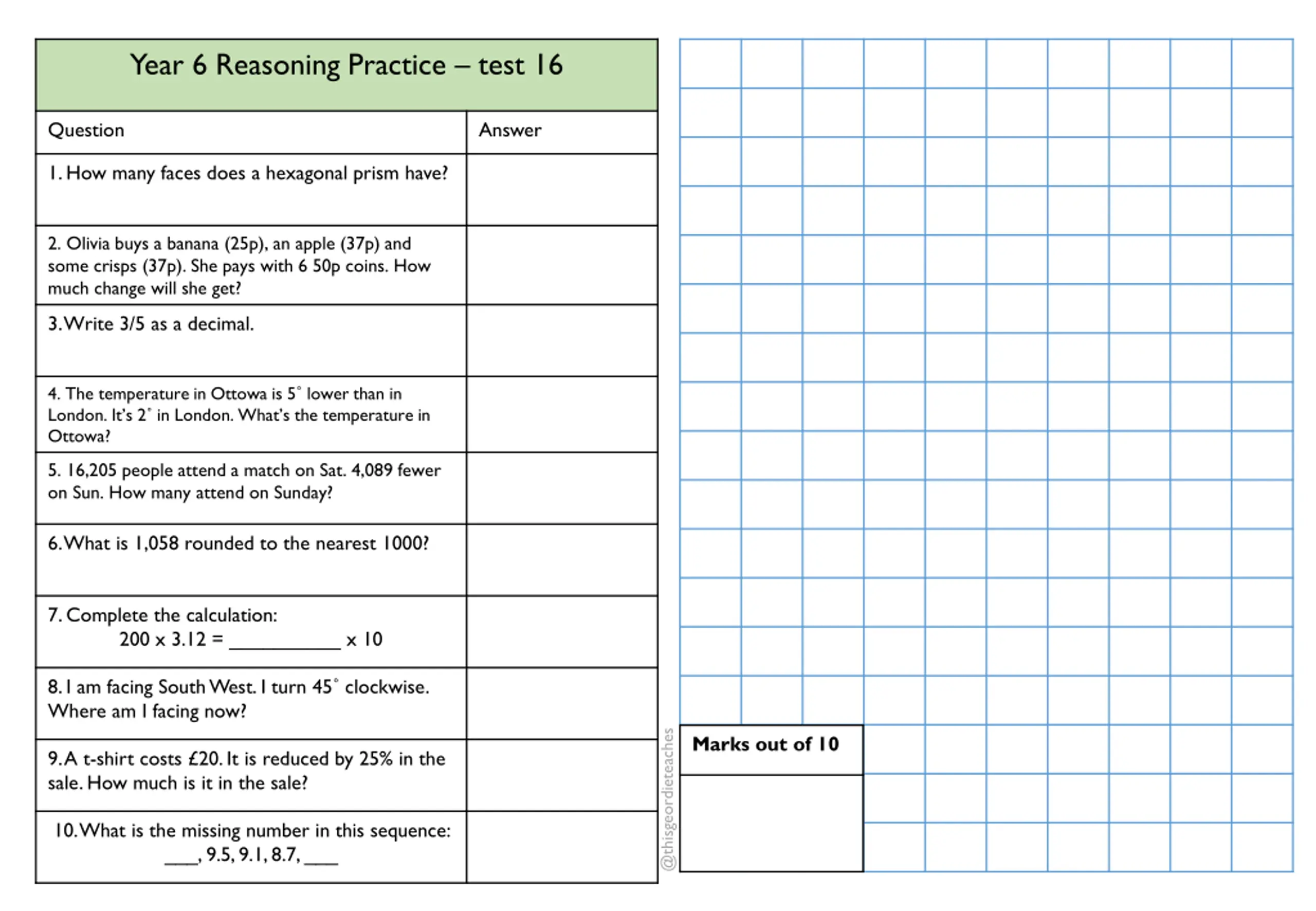Year 6 Reasoning Practice – test 16 Question Answer 1. How many faces does a hexagonal prism have? 2. Olivia buys a banana (25p), an apple (37p) and some crisps (37p). She pays with 6 50p coins. How much change will she get? 3. Write 3/5 as a decimal. 4. The temperature in Ottowa is 5˚ lower than in London. It’s 2˚ in London. What’s the temperature in Ottowa? 5. 16,205 people attend a match on Sat. 4,089 fewer on Sun. How many attend on Sunday? 6. What is 1,058 rounded to the nearest 1000? 7. Complete the calculation: 200 x 3.12 = __________ x 10 8. I am facing South West. I turn 45˚ clockwise. Where am I facing now? @thisgeordieteaches Marks out of 10 9. A t-shirt costs £20. It is reduced by 25% in the sale. How much is it in the sale? 10. What is the missing number in this sequence: ___, 9.5, 9.1, 8.7, ___