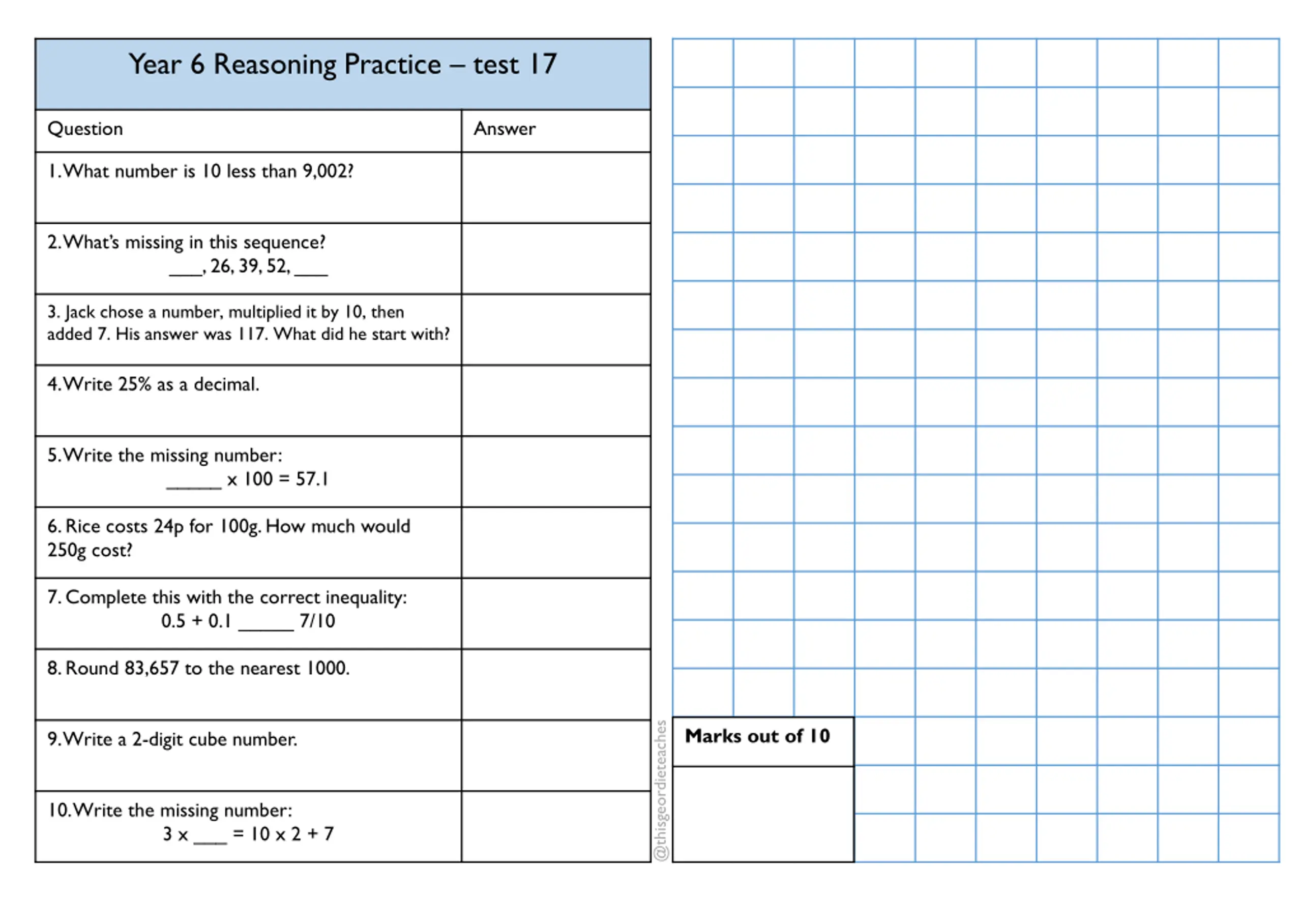Year 6 Reasoning Practice – test 17 Question Answer 1. What number is 10 less than 9,002? 2. What’s missing in this sequence? ___, 26, 39, 52, ___ 3. Jack chose a number, multiplied it by 10, then added 7. His answer was 117. What did he start with? 4. Write 25% as a decimal. 5. Write the missing number: _____ x 100 = 57.1 6. Rice costs 24p for 100g. How much would 250g cost? 7. Complete this with the correct inequality: 0.5 + 0.1 _____ 7/10 8. Round 83,657 to the nearest 1000. @thisgeordieteaches Marks out of 10 9. Write a 2-digit cube number. 10. Write the missing number: 3 x ___ = 10 x 2 + 7