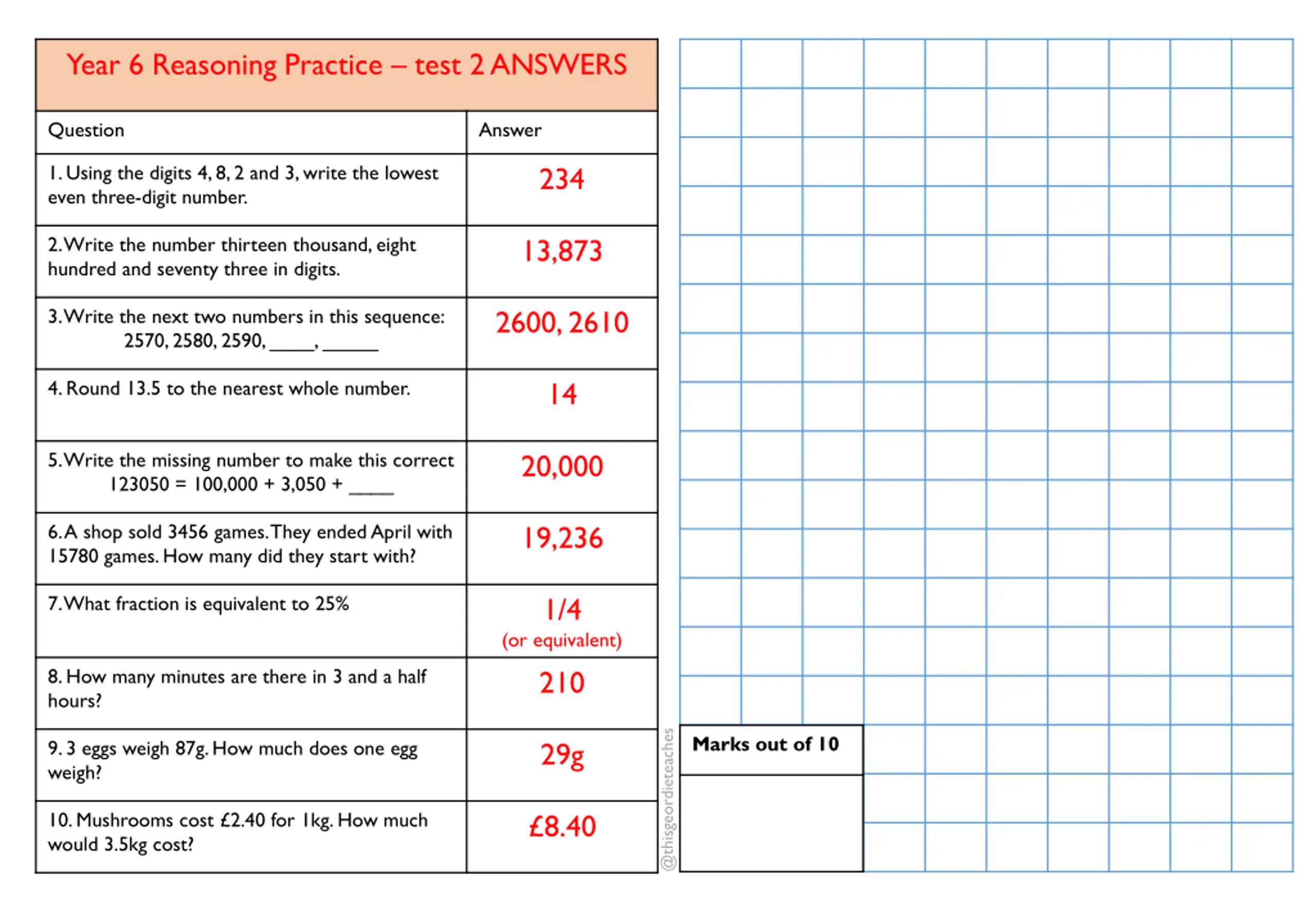 Year 6 Reasoning Practice – test 2 ANSWERS Question Answer 1. Using the digits 4, 8, 2 and 3, write the lowest even three-digit number. 234 2. Write the number thirteen thousand, eight hundred and seventy three in digits. 13,873 3. Write the next two numbers in this sequence: 2570, 2580, 2590, ____, _____ 2600, 2610 4. Round 13.5 to the nearest whole number. 14 5. Write the missing number to make this correct 123050 = 100,000 + 3,050 + ____ 20,000 6. A shop sold 3456 games. They ended April with 15780 games. How many did they start with? 19,236 7. What fraction is equivalent to 25% 1/4 (or equivalent) 210 8. How many minutes are there in 3 and a half hours? @thisgeordieteaches Marks out of 10 9. 3 eggs weigh 87g. How much does one egg weigh? 29g 10. Mushrooms cost £2.40 for 1kg. How much would 3.5kg cost? £8.40