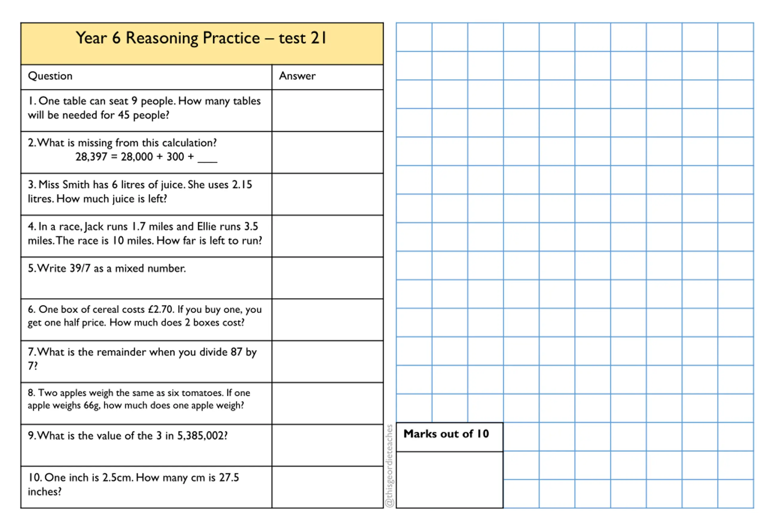 Year 6 Reasoning Practice – test 21 Question Answer 1. One table can seat 9 people. How many tables will be needed for 45 people? 2. What is missing from this calculation? 28,397 = 28,000 + 300 + ___ 3. Miss Smith has 6 litres of juice. She uses 2.15 litres. How much juice is left? 4. In a race, Jack runs 1.7 miles and Ellie runs 3.5 miles. The race is 10 miles. How far is left to run? 5. Write 39/7 as a mixed number. 6. One box of cereal costs £2.70. If you buy one, you get one half price. How much does 2 boxes cost? 7. What is the remainder when you divide 87 by 7? 8. Two apples weigh the same as six tomatoes. If one apple weighs 66g, how much does one apple weigh? @thisgeordieteaches Marks out of 10 9. What is the value of the 3 in 5,385,002? 10. One inch is 2.5cm. How many cm is 27.5 inches?