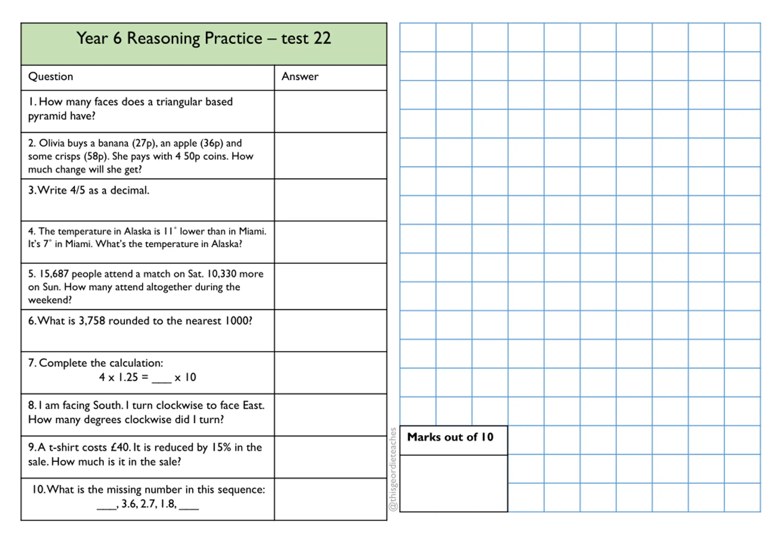 Year 6 Reasoning Practice – test 22 Question Answer 1. How many faces does a triangular based pyramid have? 2. Olivia buys a banana (27p), an apple (36p) and some crisps (58p). She pays with 4 50p coins. How much change will she get? 3. Write 4/5 as a decimal. 4. The temperature in Alaska is 11˚ lower than in Miami. It’s 7˚ in Miami. What’s the temperature in Alaska? 5. 15,687 people attend a match on Sat. 10,330 more on Sun. How many attend altogether during the weekend? 6. What is 3,758 rounded to the nearest 1000? 7. Complete the calculation: 4 x 1.25 = ___ x 10 8. I am facing South. I turn clockwise to face East. How many degrees clockwise did I turn? @thisgeordieteaches Marks out of 10 9. A t-shirt costs £40. It is reduced by 15% in the sale. How much is it in the sale? 10. What is the missing number in this sequence: ___, 3.6, 2.7, 1.8, ___