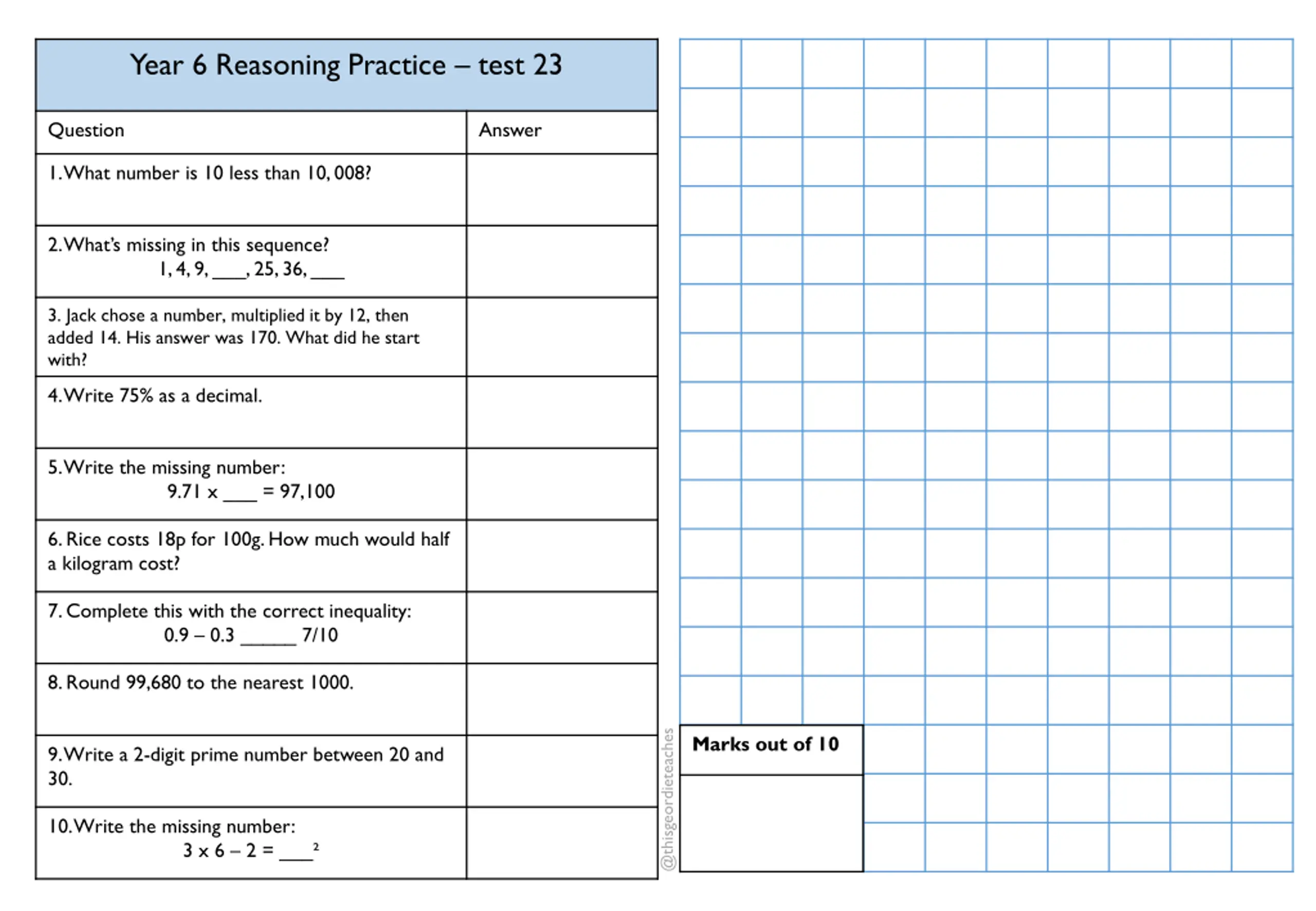 Year 6 Reasoning Practice – test 23 Question Answer 1. What number is 10 less than 10, 008? 2. What’s missing in this sequence? 1, 4, 9, ___, 25, 36, ___ 3. Jack chose a number, multiplied it by 12, then added 14. His answer was 170. What did he start with? 4. Write 75% as a decimal. 5. Write the missing number: 9.71 x ___ = 97,100 6. Rice costs 18p for 100g. How much would half a kilogram cost? 7. Complete this with the correct inequality: 0.9 – 0.3 _____ 7/10 8. Round 99,680 to the nearest 1000. @thisgeordieteaches Marks out of 10 9. Write a 2-digit prime number between 20 and 30. 10. Write the missing number: 3 x 6 – 2 = ___²