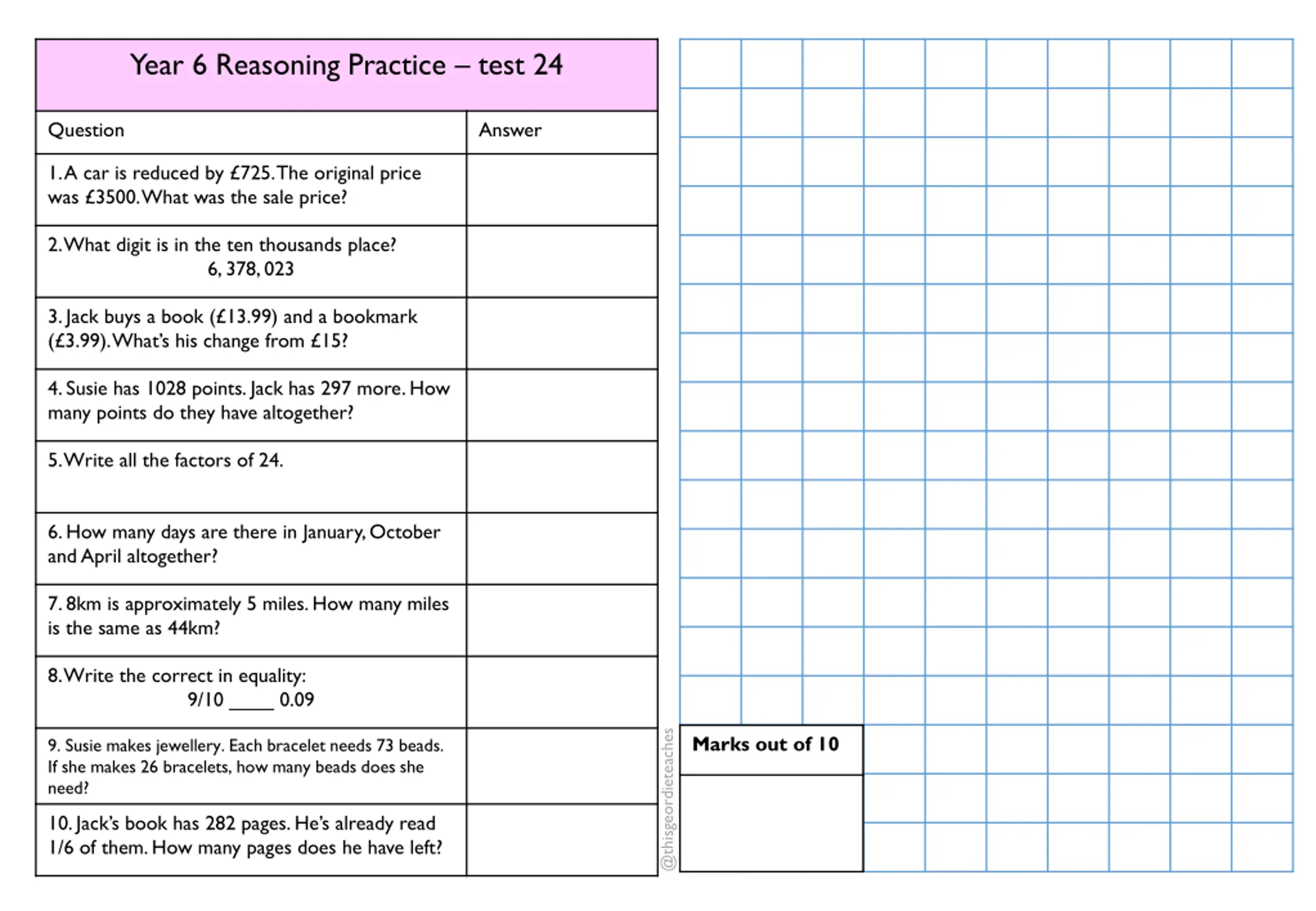 Year 6 Reasoning Practice – test 24 Question Answer 1. A car is reduced by £725. The original price was £3500. What was the sale price? 2. What digit is in the ten thousands place? 6, 378, 023 3. Jack buys a book (£13.99) and a bookmark (£3.99). What’s his change from £15? 4. Susie has 1028 points. Jack has 297 more. How many points do they have altogether? 5. Write all the factors of 24. 6. How many days are there in January, October and April altogether? 7. 8km is approximately 5 miles. How many miles is the same as 44km? 8. Write the correct in equality: 9/10 ____ 0.09 @thisgeordieteaches Marks out of 10 9. Susie makes jewellery. Each bracelet needs 73 beads. If she makes 26 bracelets, how many beads does she need? 10. Jack’s book has 282 pages. He’s already read 1/6 of them. How many pages does he have left?