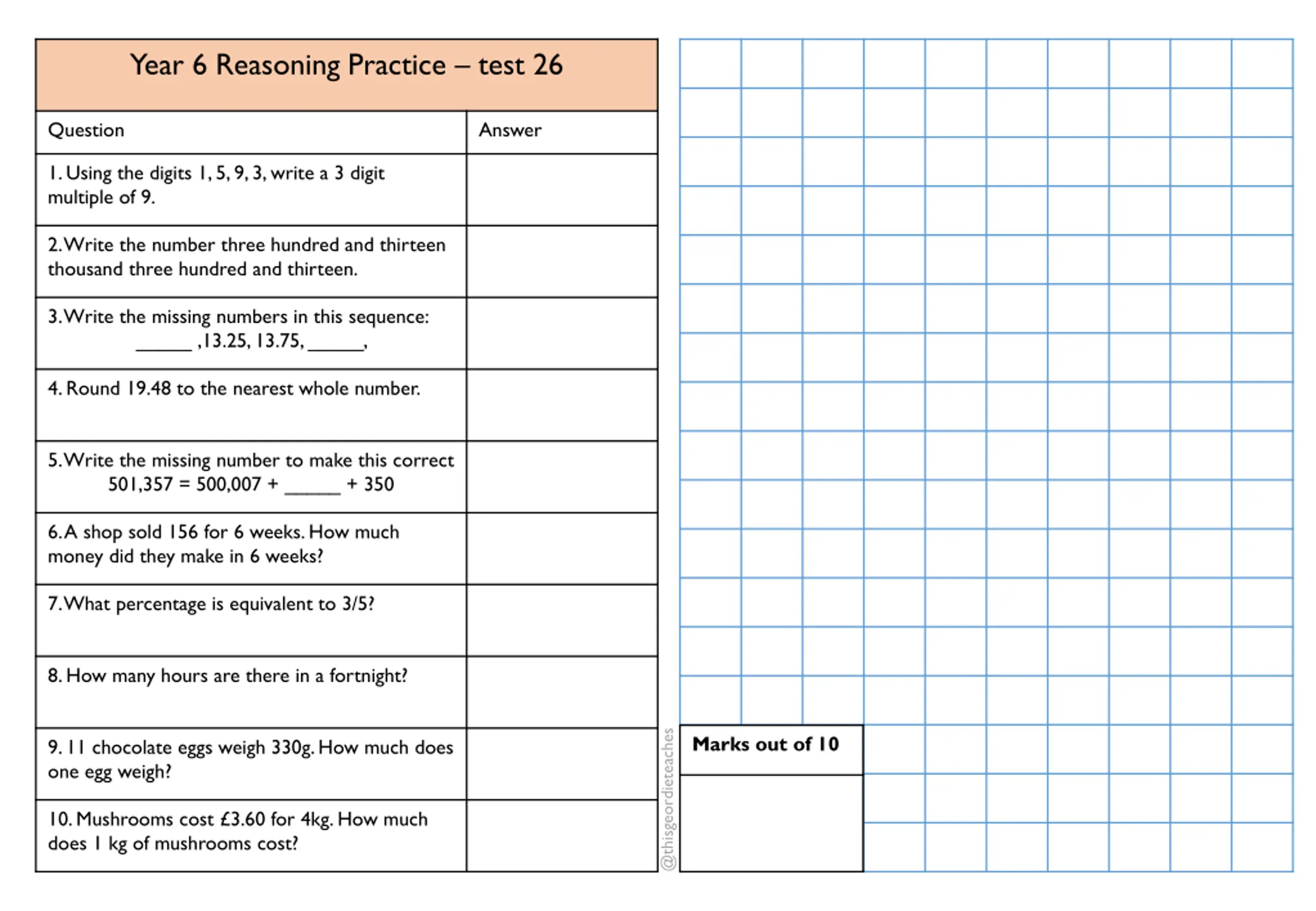 Year 6 Reasoning Practice – test 26 Question Answer 1. Using the digits 1, 5, 9, 3, write a 3 digit multiple of 9. 2. Write the number three hundred and thirteen thousand three hundred and thirteen. 3. Write the missing numbers in this sequence: _____ ,13.25, 13.75, _____, 4. Round 19.48 to the nearest whole number. 5. Write the missing number to make this correct 501,357 = 500,007 + _____ + 350 6. A shop sold 156 for 6 weeks. How much money did they make in 6 weeks? 7. What percentage is equivalent to 3/5? 8. How many hours are there in a fortnight? @thisgeordieteaches Marks out of 10 9. 11 chocolate eggs weigh 330g. How much does one egg weigh? 10. Mushrooms cost £3.60 for 4kg. How much does 1 kg of mushrooms cost?